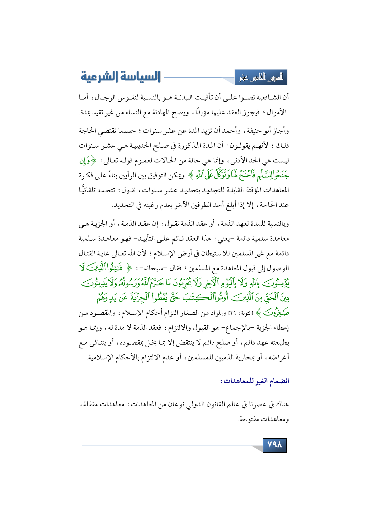 أن الشافعية نصوا على أن تأقيت الهدنة هو بالنسبة لنفوس الرجال، أما الأموال؛ فيجوز العقد عليها مؤبدًا، ويصح المهادنة مع النساء من غير تقيد بمدة.