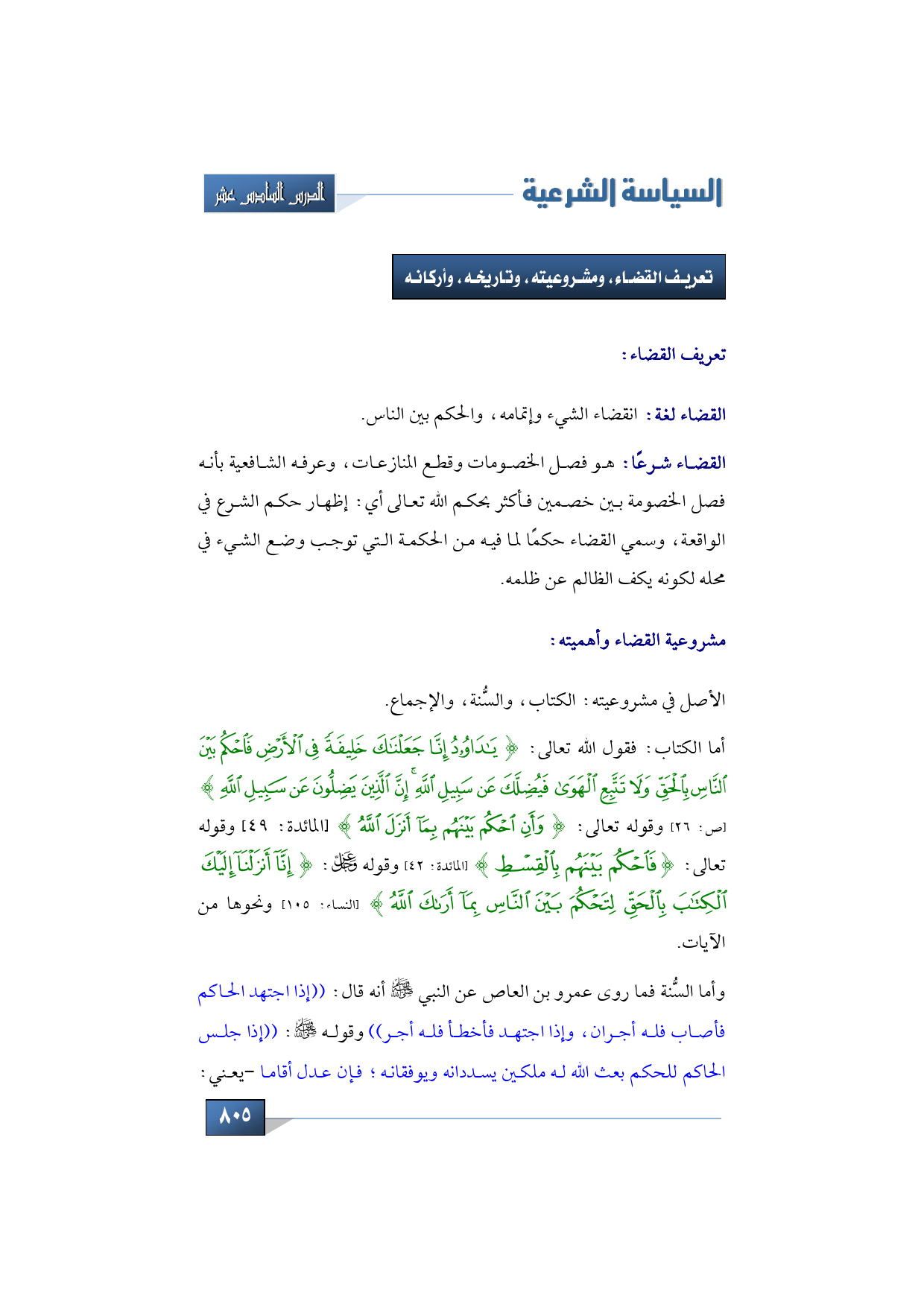 نبدأ الآن الحديث عن النظام القضائي في الإسلام، فنعرف القضاء، ونبين دليل مشروعيته، وبيان أهميته، وتاريخه عبر العصور الإسلامية المتلاحقة: