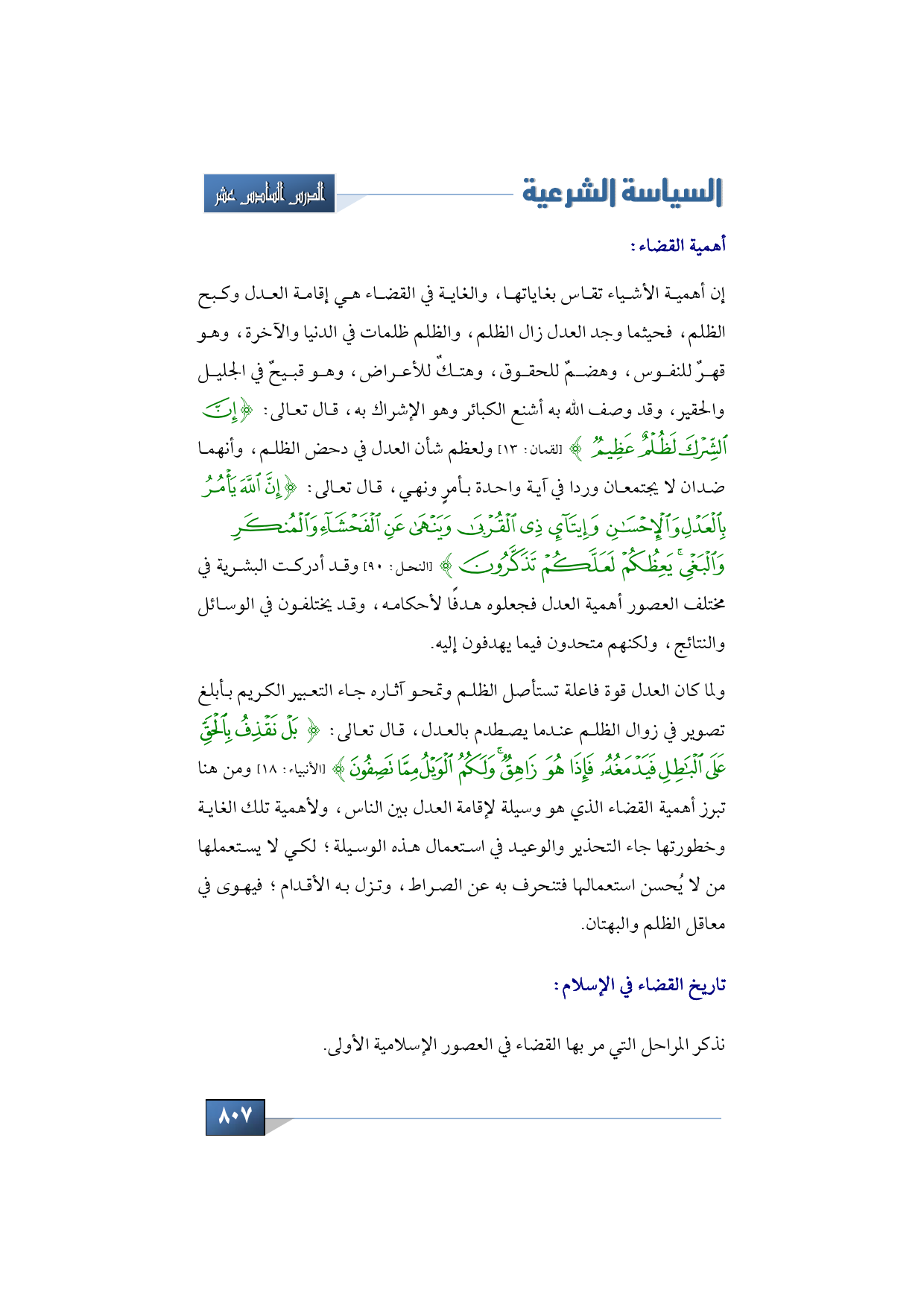 ولما كان العدل قوة فاعلة تستأصل الظلم وتمحو آثاره جاء التعبير الكريم بأبلغ تصوير في زوال الظلم عندما يصطدم بالعدل، قال تعالى: {بَلْ نَقْذِفُ بِالحَقِّ عَلَى الْبَاطِلِ فَيَدْمَغُهُ فَإِذَا هُوَ زَاهِقٌ ولَكُمْ الْوَيْلُ مِمَّا تَصِفُونَ} (الأنبياء: 18) ومن هنا تبرز أهمية القضاء الذي هو وسيلة لإقامة العدل بين الناس، ولأهمية تلك الغاية وخطورتها جاء التحذير والوعيد في استعمال هذه الوسيلة؛ لكي لا يستعملها من لا يُحسن استعمالها فتنحرف به عن الصراط، وتزل به الأقدام؛ فيهوى في معاقل الظلم والبهتان.