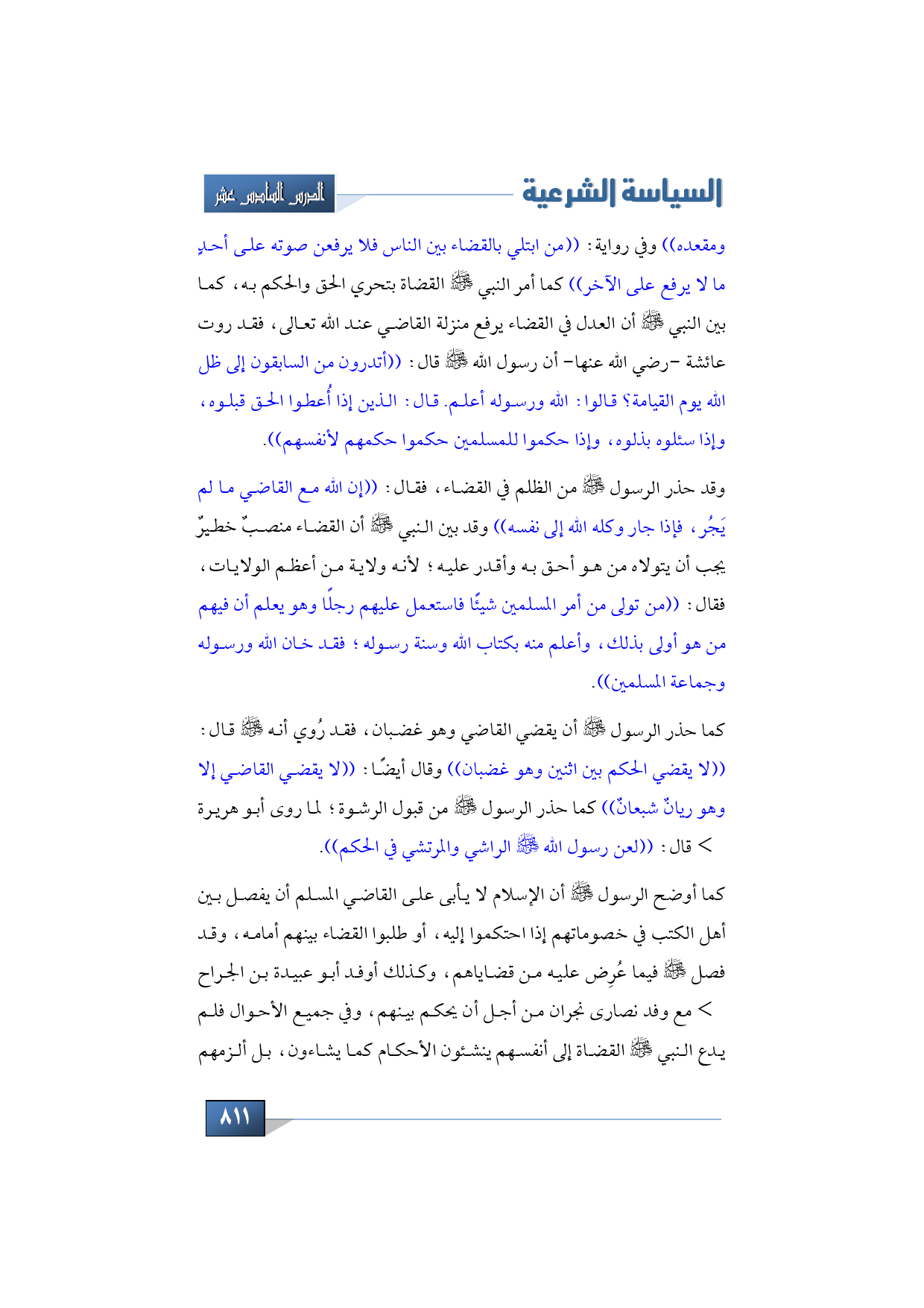 ومقعده)) وفي رواية: ((من ابتلي بالقضاء بين الناس فلا يرفعن صوته على أحدٍ ما لا يرفع على الآخر)) كما أمر النبي -صلى الله عليه وسلم- القضاة بتحري الحق والحكم به، كما بين النبي -صلى الله عليه وسلم- أن العدل في القضاء يرفع منزلة القاضي عند الله تعالى، فقد روت عائشة -رضي الله عنها- أن رسول الله -صلى الله عليه وسلم- قال: ((أتدرون من السابقون إلى ظل الله يوم القيامة؟ قالوا: الله ورسوله أعلم، قال: الذين إذا أُعطوا الحق قبلوه، وإذا سئلوه بذلوه، وإذا حكموا للمسلمين حكموا حكمهم لأنفسهم)).