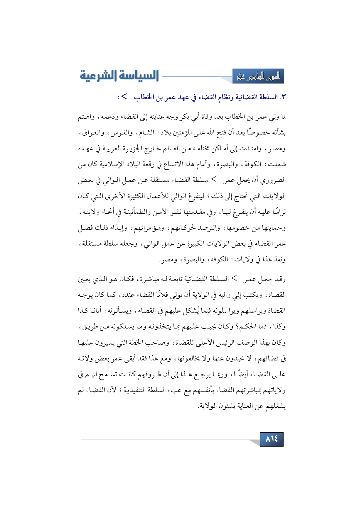 ثالثًا: ثم نتحدث الآن عن السلطة القضائية ونظام القضاء في عهد عمر بن الخطاب فنقول: