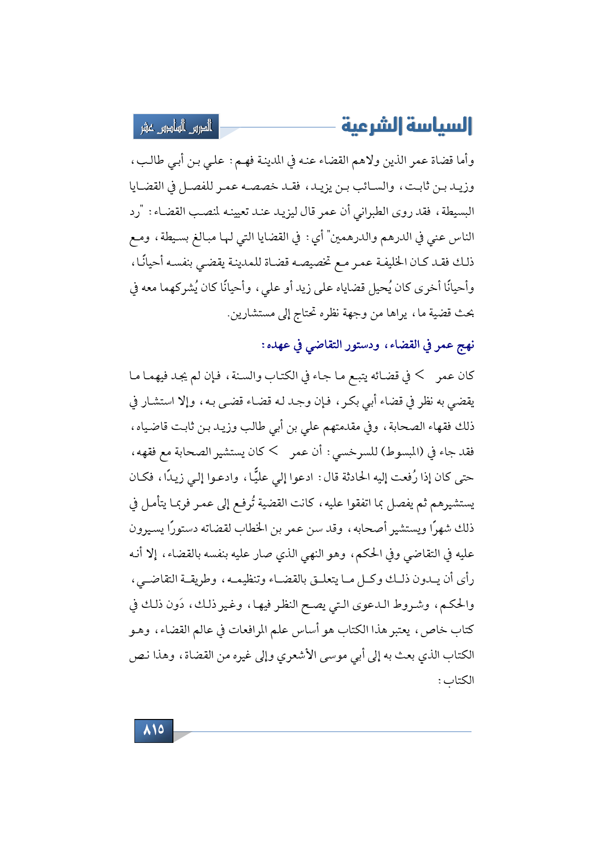 نهج عمر في القضاء ودستور التقاضي في عهده: كان عمر -رضي الله عنه- في قضائه يتبع ما جاء في الكتاب والسنة، فإن لم يجد فيهما ما يقضي به نظر في قضاء أبي بكر، فإن وجد له قضاء قضى به، وإلا استشار في ذلك فقهاء الصحابة وفي مقدمتهم علي بن أبي طالب وزيد بن ثابت قاضياه، فقد جاء في (المبسوط) للسرخسي: أن عمر -رضي الله عنه- كان يستشر الصحابة مع فقهه، حتى كان إذا رُفعت إليه الحادثة قال: ادعوا إلي عليًا وادعوا إلي زيدًا، فكان يستشرهم ثم يفصل بما اتفقوا عليه، كانت القضية تُرفع إلى عمر فربما يتأمل في ذلك شهرًا ويستشير أصحابه، وقد سن عمر بن الخطاب لقضاة دستورًا يسيرون عليه في التقاضي وفي الحكم، وهو النهي الذي صار عليه بنفسه بالقضاء، إلا أنه رأى أن يدون ذلك وكل ما يتعلق بالقضاء وتنظيمه، وطريقة التقاضي، والحكم، وشروط الدعوى التي يصح النظر فيها، وغير ذلك، دون ذلك في كتاب خاص يعتبر هذا الكتاب هو أساس علم المرافعات في عالم القضاء، وهو الكتاب الذي بعث به إلى أبي موسى الأشعري وإلى غيره من القضاة، وهذا نص الكتاب: