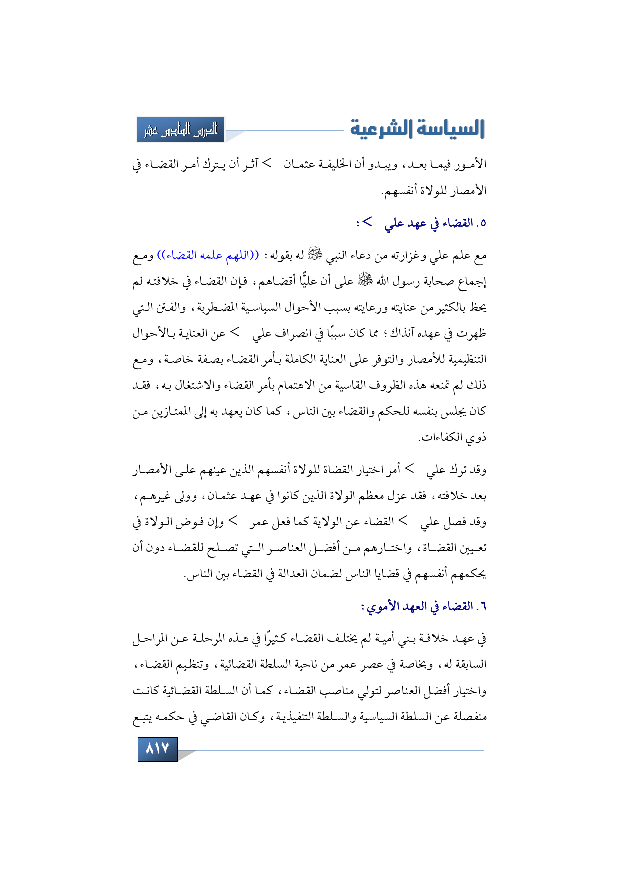 رابعًا: وإذا نظرنا إلى القضاء في عهد علي -أي: أننا ننتقل الآن إلى النظر في القضاء في عهد علي -رضي الله عنه- فنقول: مع علم علي وغزارته من دعاء النبي -صلى الله عليه وسلم- له بقوله: ((اللهم علمه القضاء)) ومع إجماع صحابة رسول الله -صلى الله عليه وسلم- على أن عليًا أقضاهم، فإن القضاء في خلافته لم يحظ بالكثير من عنايته ورعايته بسبب الأحوال السياسة المضطربة، والفتن التي ظهرت في عهد آنذاك مما كان سببًا في انصراف علي -رضي الله عنه- عن العناية بالأحوال التنظيمية للأمصار والتوفر على العناية الكاملة بأمر القضاء بصفة خاصة، ومع ذلك لم تمنعه هذه الظروف القاسية من الاهتمام بأمر القضاء والاشتغال به، فقد كان يجلس بنفسه للحكم والقضاء بين الناس كما كان يعهد به إلى الممتازين من ذوي الكفاءات، وقد ترك علي -رضي الله عنه- أمر اختيار القضاة للولاة أنفسهم الذين عينهم على الأمصار بعد خلافته، فقد عزل معظم الولاة الذين كانوا في عهد عثمان وولى غيرهم، وقد فصل علي -رضي الله عنه- القضاء عن الولاية كما فعل عمر -رضي الله عنه- وإن فوض الولاة في تعيين القضاة، واختيارهم من أفضل العناصر التي تصلح للقضاء دون أن يحكمهم بأنفسهم في قضايا الناس لضمان العدالة في القضاء بين الناس.