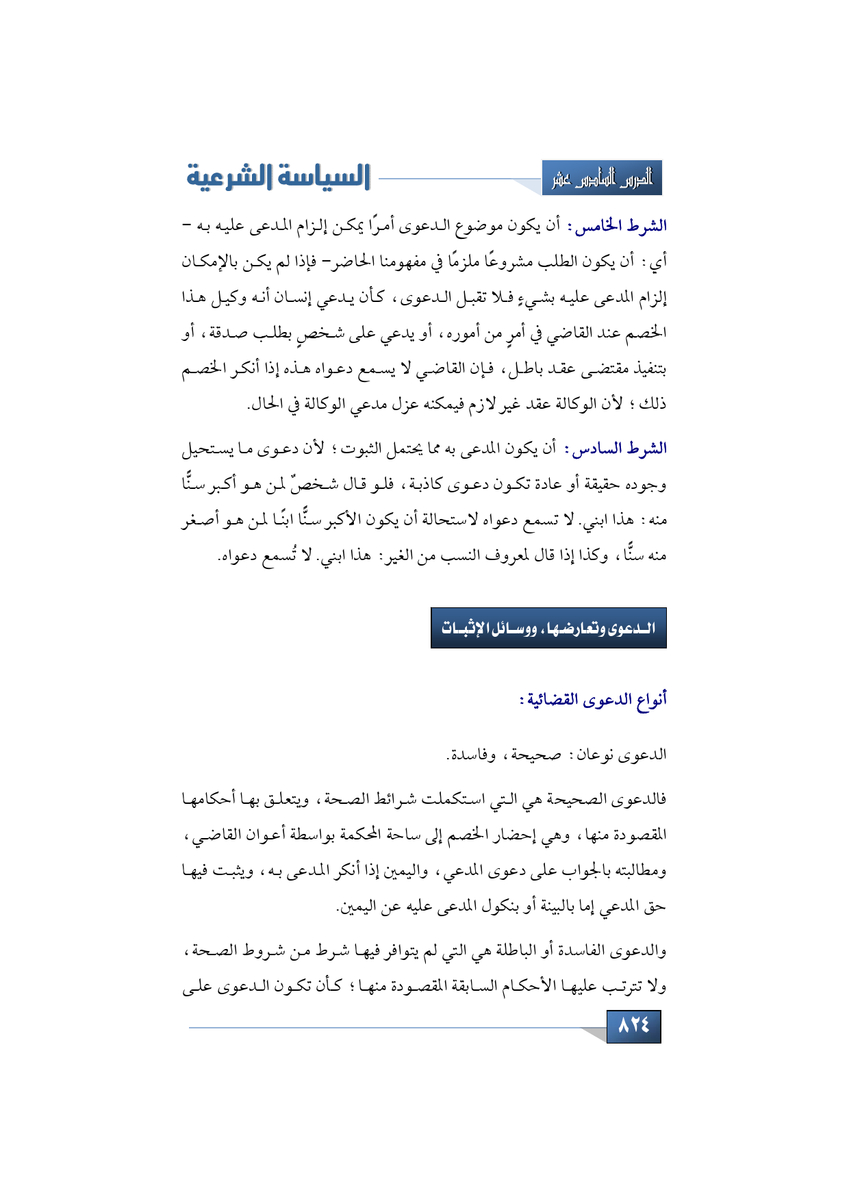 الشرط الخامس في الدعوى: أن يكون موضوع الدعوى أمرًا يمكن إلزام المدعى عليه به -أي: أن يكون الطلب مشروعًا ملزمًا في مفهومنا الحاضر- فإذا لم يكن بالإمكان إلزام المدعى عليه بشيءٍ فلا تقبل الدعوى كأن يدعي إنسان أنه وكيل هذا الخصم عند القاضي في أمرٍ من أموره، أو يدعى على شخصٍ بطلب صدقة، أو بتنفيذ مقتضى عقد باطل، فإن القاضي لا يسمع دعواه هذه إذا أنكر الخصم ذلك؛ لأن الوكالة عقد غير لازم فيمكنه عزل مدعي الوكالة في الحال.