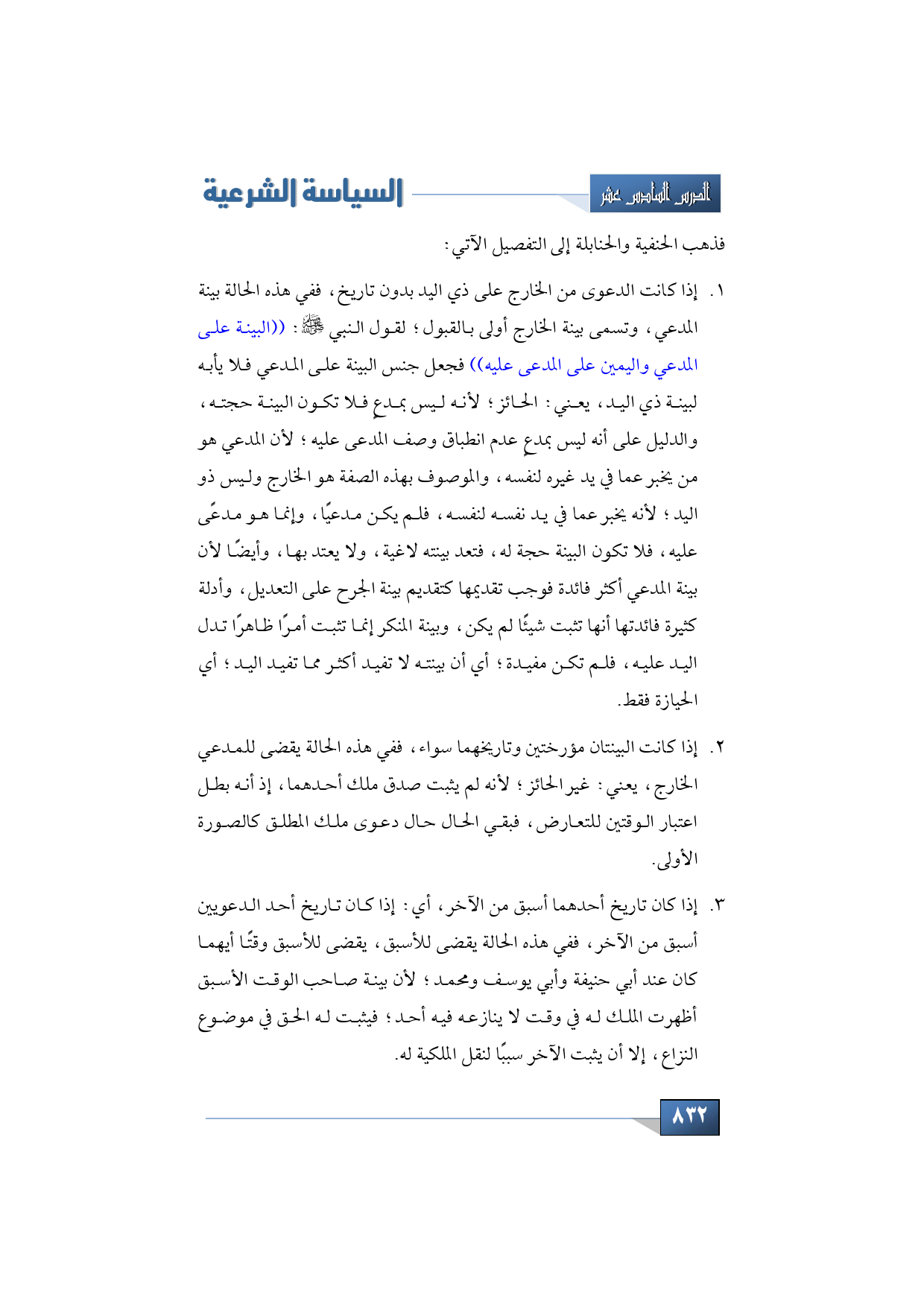 1 - إذا كانت الدعوى من الخارج على ذي اليد بدون تاريخ، ففي هذه الحالة بينة المدعي، وتسمى بينة الخارج أولى بالقبول؛ لقول النبي -صلى الله عليه وسلم- لقول النبي -صلى الله عليه وسلم-: ((البينة على المدعي واليمين على المدعى عليه)) فجعل جنس البينة على المدعي فلا يأبه لبينة ذي اليد، يعني: الحائز؛ لأنه ليس بمدعٍ فلا تكون البينة حجته، والدليل على أنه ليس بمدعٍ عدم انطباق وصف المدعى عليه؛ لأن المدعي هو من يخبر عما في يد غيره لنفسه والموصوف بهذه الصفة هو الخارج وليس ذو اليد؛ لأنه يخبر عما في يد نفسه لنفسه، فلم يكن مدعيًا وإنما هو مدعى عليه، فلا تكون البينة حجة له، فتعد بينته لاغية، ولا يعتد بها، وأيضًا لأن بينة المدعي أكثر فائدة فوجب تقديمها كتقديم بينة الجرح على التعديل، ودليل كثيرة فائدتها أنها تثبت شيئًا لم يكن، وبينة المنكر إنما تثبت أمرًا ظاهرًا تدل اليد عليه، فلم تكن مفيدة، أي: أن بينته لا تفيد أكثر مما تفيد اليد أي الحيازة فقط.