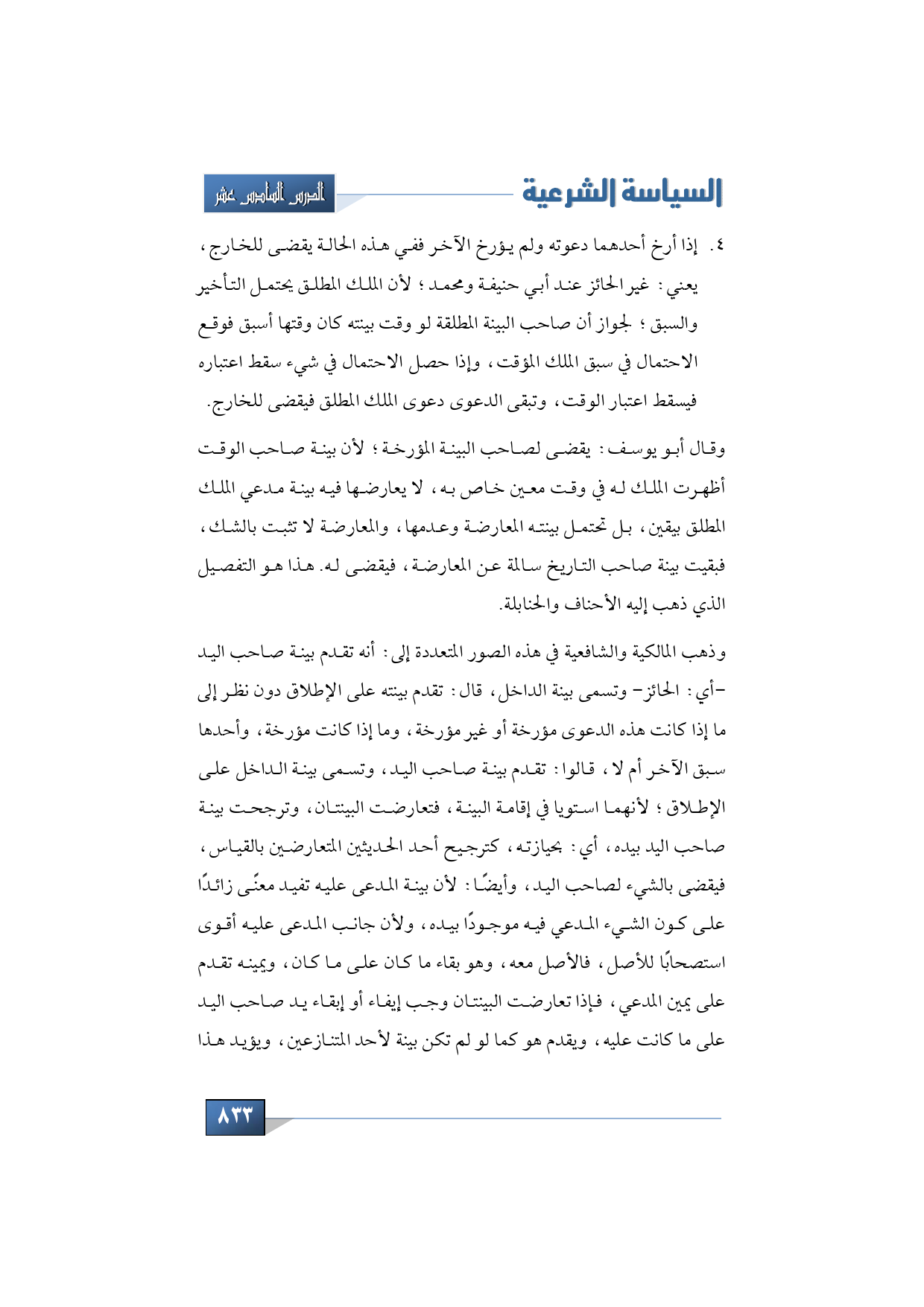 4 - إذا أرخ أحدهما ولم يؤرخ الآخر، أي: إذا أرخ أحدهما دعوته، ولم يؤرخ الآخر دعوته، ففي هذه الحالة يقضى للخارج، يعني: غير الحائز عند أبي حنيفة ومحمد؛ لأن الملك المطلق يحتمل التأخير والسبق؛ لجواز أن صاحب البينة المطلقة لو وقت بينته كان وقتها أسبق فوقع الاحتمال في سبق الملك المؤقت، وإذا حصل الاحتمال في شيء سقط اعتباره فيسقط اعتبار الوقت، وتبقى الدعوى دعوى ملك المطلق فيقضي للخارج.