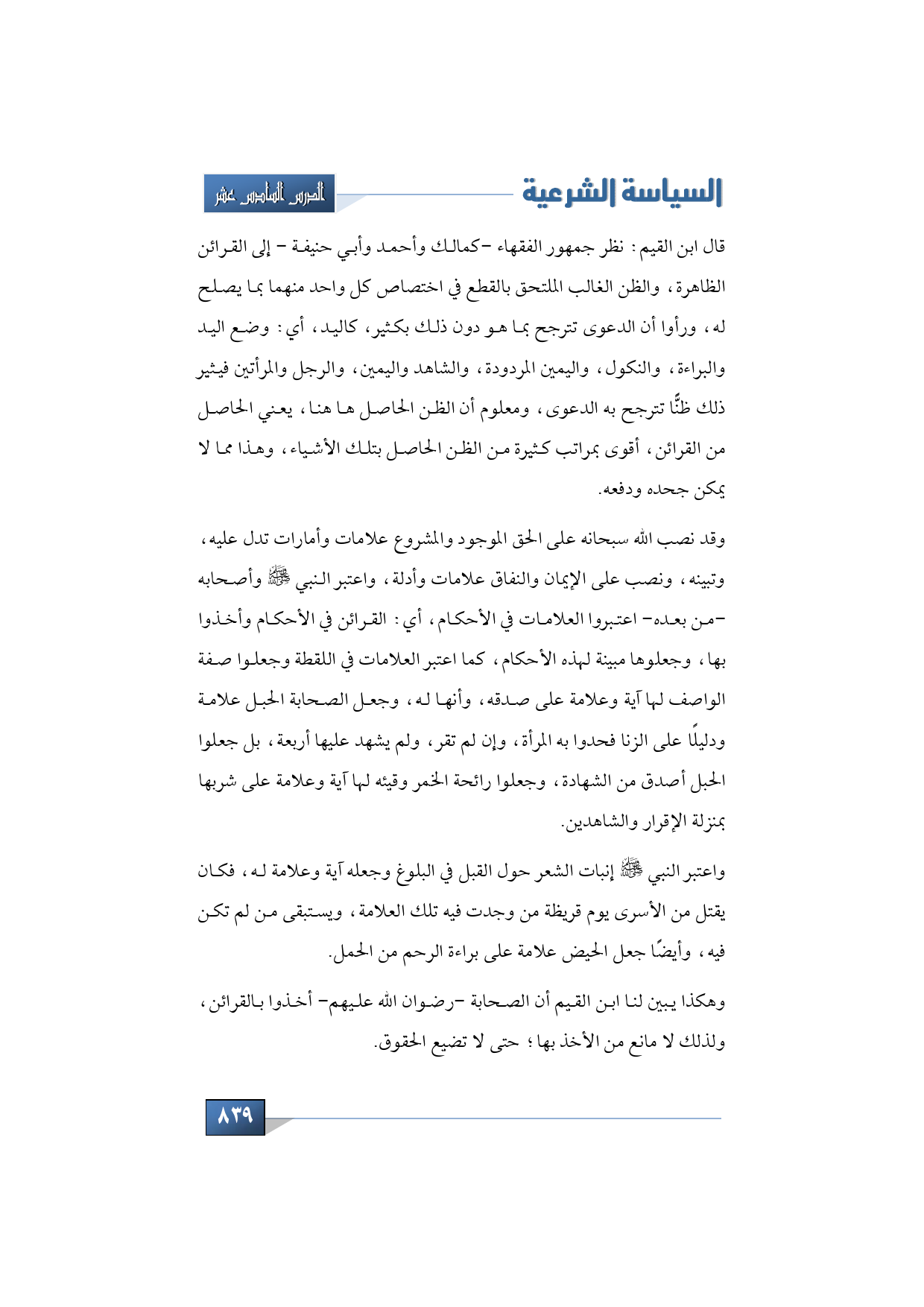 وهكذا يبين لنا ابن القيم أن الصحابة -رضوان الله عليهم- أخذوا بالقرائن، ولذلك لا مانع من الأخذ بها؛ حتى لا تضيع الحقوق.