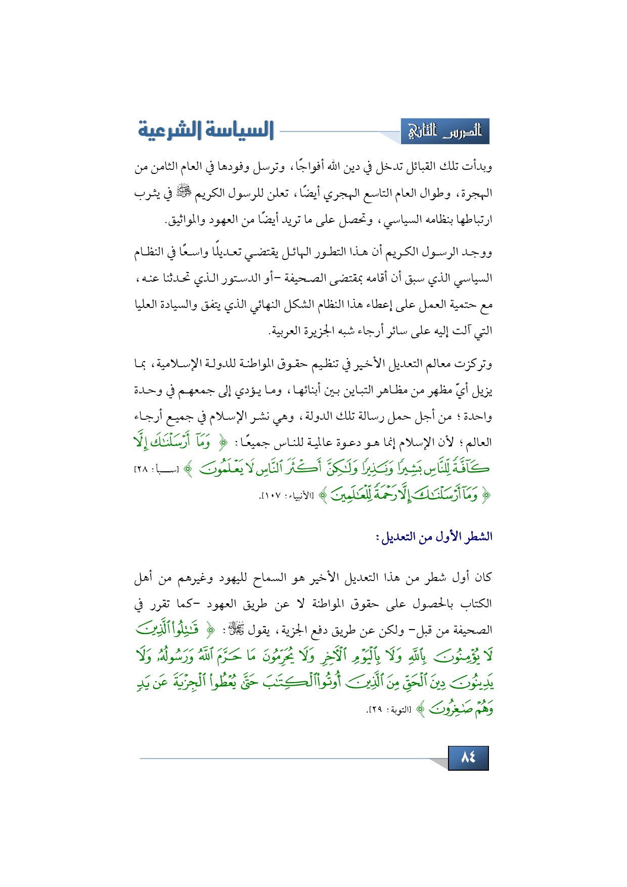 وكان أول شطر من هذا التعديل الأخير هو السماح لليهود، وغيرهم من أهل الكتاب بالحصول على حقوق المواطنة لا عن طريق العهود -كما تقرر في الصحيفة من قبل- ولكن عن طريق دفع الجزية، يقول: -تبارك وتعالى- {قَاتِلُوا الَّذِينَ لا يُؤْمِنُونَ بِاللَّهِ وَلا بِالْيَوْمِ الآخِرِ وَلا يُحَرِّمُونَ مَا حَرَّمَ اللَّهُ وَرَسُولُهُ وَلا يَدِينُونَ دِينَ الْحَقِّ مِنْ الَّذِينَ أُوتُوا الْكِتَابَ حَتَّى يُعْطُوا الْجِزْيَةَ عَنْ يَدٍ وَهُمْ صَاغِرُونَ} (التوبة: 29).