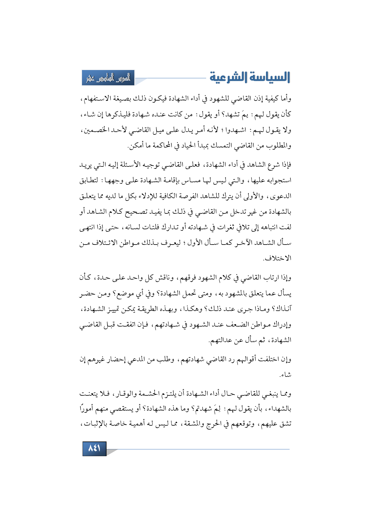 ومما ينبغي للقاضي حال أداء الشهادة أن يلتزم الحشمة والوقار، فلا يتعنت بالشهداء، بأن يقول لهم: لِمَ شهدتم؟ وما هذه الشهادة؟ أو يستقصي منهم أمورًا تشق عليهم، وتوقعهم في الحرج والمشقة، مما ليس له أهمية خاصة بالإثبات،