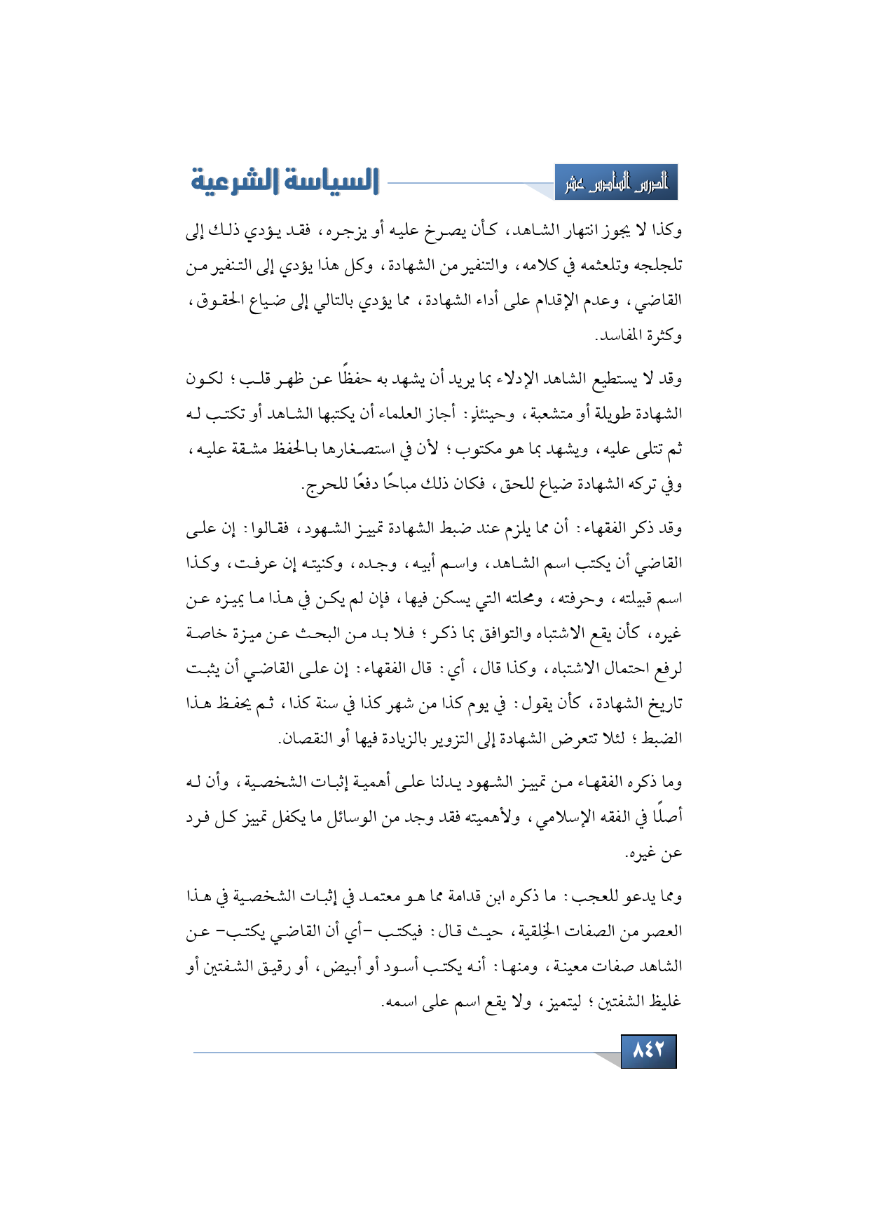 ومما يدعو للعجب: ما ذكره ابن قدامة مما هو معتمد في إثبات الشخصية في هذا العصر من الصفات الخِلقية، حيث قال: فيكتب -أي أن القاضي يكتب- عن الشاهد صفات معينة، ومنها: أنه يكتب أسود أو أبيض، أو رقيق الشفتين أو غليظ الشفتين؛ ليتميز، ولا يقع اسم على اسمه.