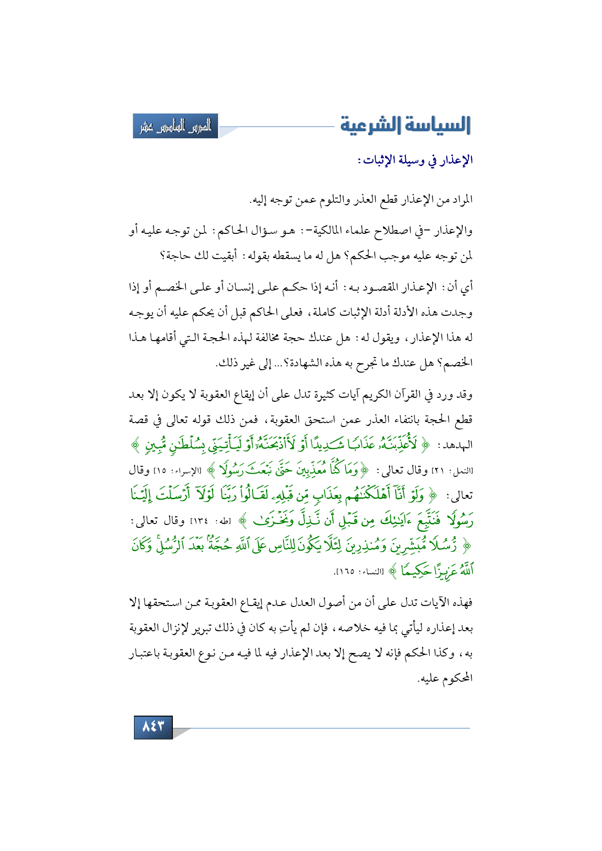 فهذه الآيات تدل على أن من أصول العدل عدم إيقاع العقوبة ممن استحقها إلا بعد إعذاره ليأتي بما فيه خلاصه، فإن لم يأتِ به كان في ذلك تبرير لإنزال العقوبة به، وكذا الحكم فإنه لا يصح إلا بعد الإعذار فيه لما فيه من نوع العقوبة باعتبار المحكوم عليه.