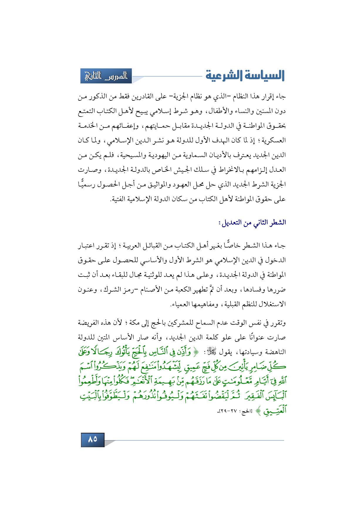 وجاء الشطر الثاني من التعديل الأخير في النظام السياسي خاصًّا بغير أهل الكتاب من القبائل العربية؛ إذ تقرر اعتبار الدخول في الدين الإسلامي هو الشرط الأول، والأساسي للحصول على حقوق المواطنة في الدولة الجديدة، وعلى هذا لم يعد للوثنية مجال للبقاء، بعد أن ثبت ضررها وفسادها، وبعد أن تم تطهير الكعبة من الأصنام -رمز الشرك، وعنون الاستغلال للنظم القبلية، ومفاهيمها العمياء.