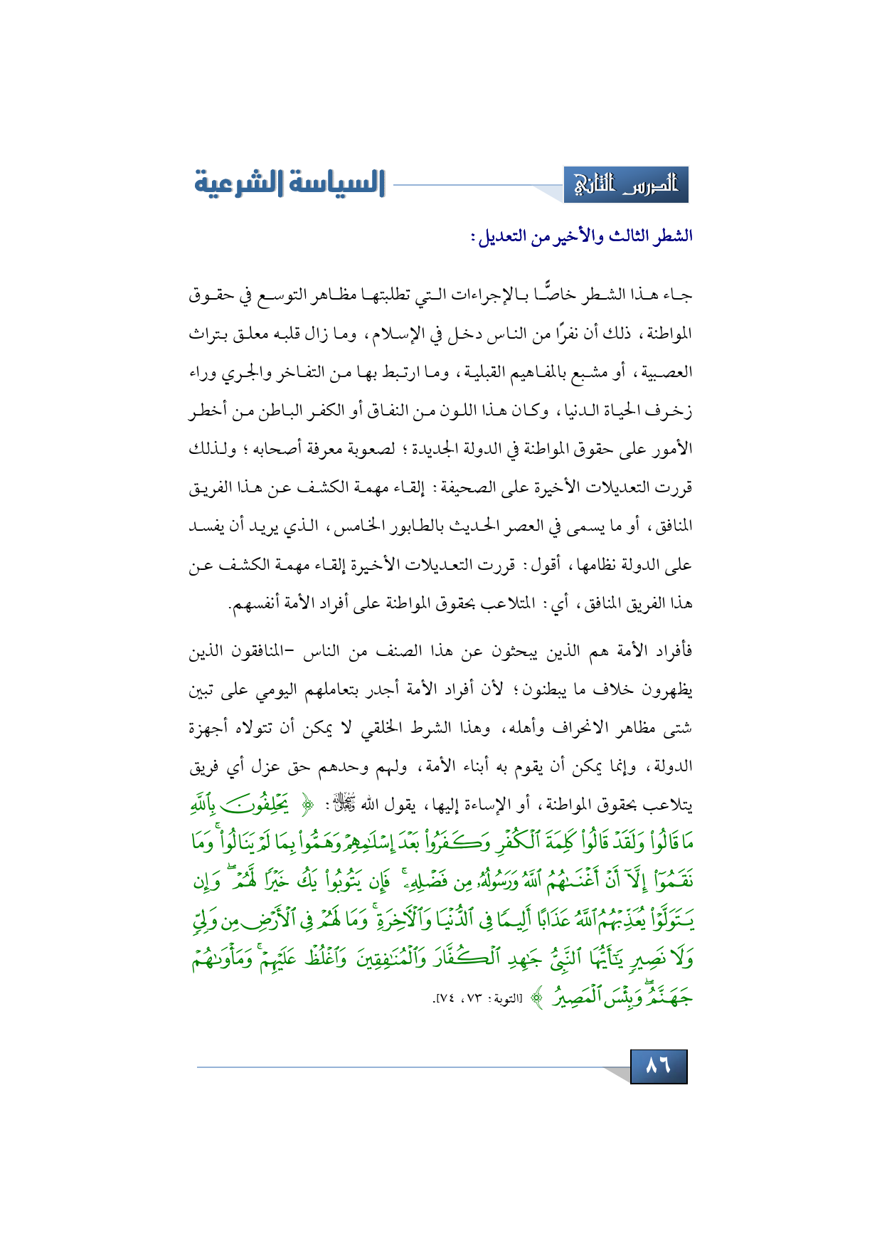وجاء الشطر الثالث والأخير -من هذا التعديل- خاصًّا بالإجراءات التي تطلبتها مظاهر التوسع في حقوق المواطنة، ذلك أن نفرًا من الناس دخل في الإسلام، وما زال قلبه معلق بتراث العصبية، أو مشبع بالمفاهيم القبلية، وما ارتبط بها من التفاخر، والجري وراء زخرف الحياة الدنيا، وكان هذا اللون من النفاق، أو الكفر الباطن من أخطر الأمور على حقوق المواطنة في الدولة الجديدة، لماذا لصعوبة معرفة أصحابه؛ ولذلك قررت التعديلات الأخيرة على الصحيفة: إلقاء مهمة الكشف عن هذا الفريق المنافق، أو ما يسمى في العصر الحديث بالطابور الخامس، الذي يريد أن يفسد على الدولة نظامها، أقول: قررت التعديلات الأخيرة إلقاء مهمة الكشف عن هذا الفريق المنافق، أي: المتلاعب بحقوق المواطنة على أفراد الأمة أنفسهم.