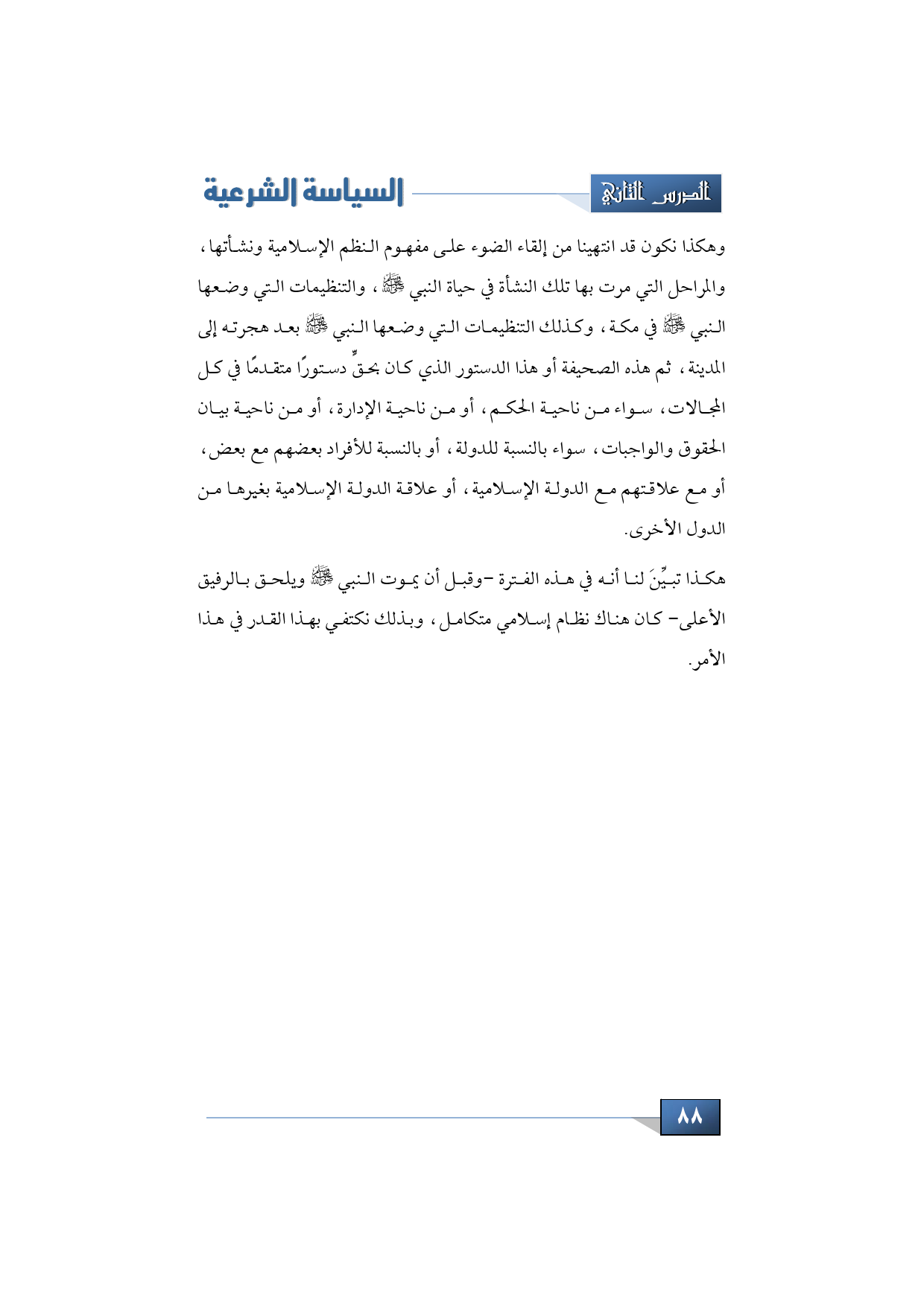 وهكذا نكون قد انتهينا من إلقاء الضوء على مفهوم النظم الإسلامية، ونشأتها، والمراحل التي مرت بها تلك النشأة في حياة النبي -صلى الله عليه وسلم- والتنظيمات التي وضعها النبي -صلى الله عليه وسلم- في مكة، وكذلك التنظيمات التي وضعها النبي -صلى الله عليه وسلم- بعد هجرته إلى المدينة، ثم هذه الصحيفة، أو هذا الدستور الذي كان -بحق- دستورًا متقدمًا في كل المجالات، سواء من ناحية الحكم، أو من ناحية الإدارة، أو من ناحية بيان الحقوق، والواجبات سواء بالنسبة للدولة، أو بالنسبة للأفراد بعضهم مع بعض، أو مع علاقتهم مع الدولة الإسلامية، أو علاقة الدولة الإسلامية بغيرها من الدول الأخرى.