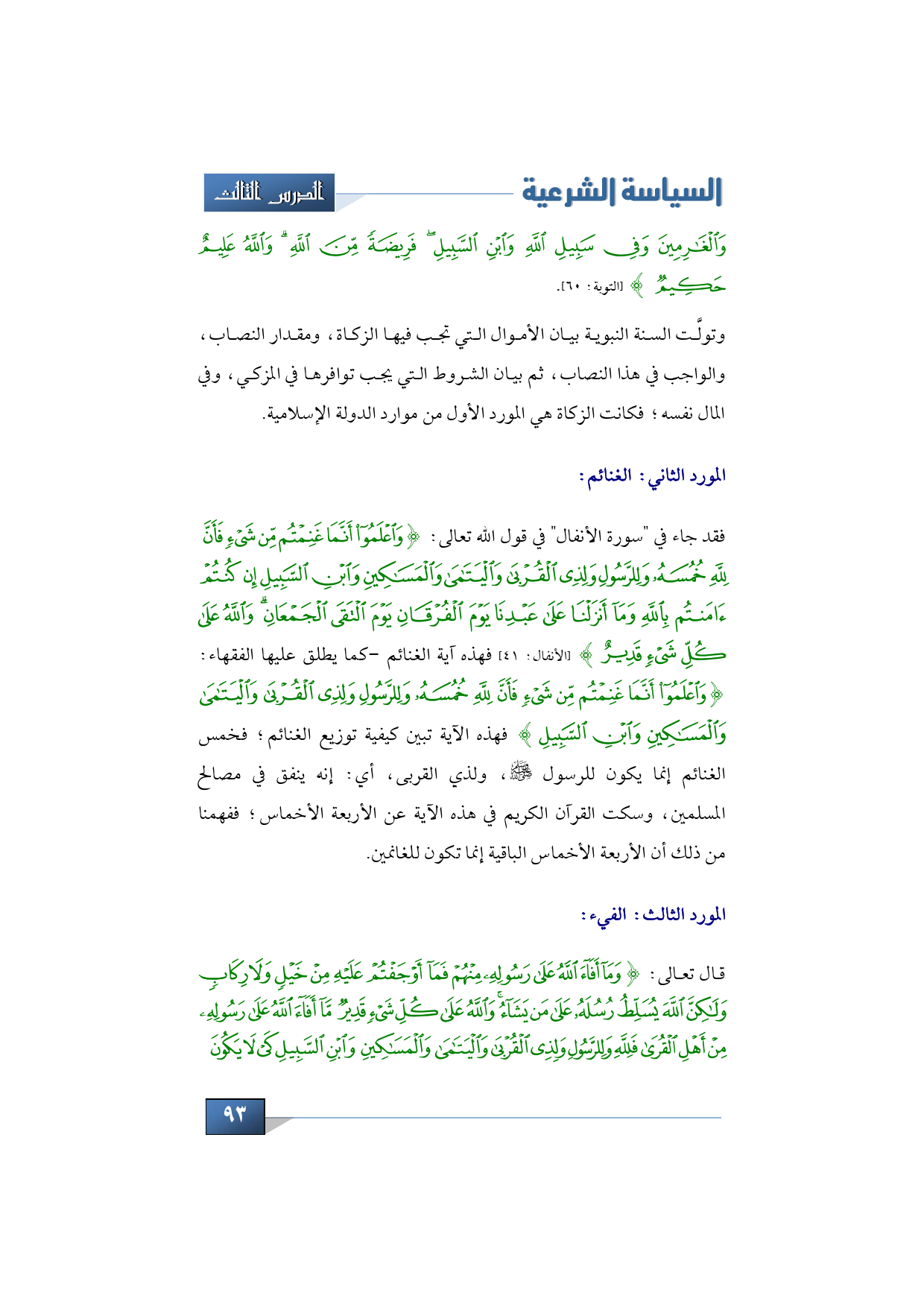 ثم يجيء المورد الثالث من الموارد المالية للدولة الإسلامية، وهو الفيء في قول الله تعالى: {وَمًَا أَفَاءَ اللَّهُ عَلَى رَسُولِهِ مِنْهُمْ فَمَا أَوْجَفْتُمْ عَلَيْهِ مِنْ خَيْلٍ وَلا رِكَابٍ وَلَكِنَّ اللَّهَ يُسَلِّطُ رُسُلَهُ عَلَى مَنْ يَشَاءُ وَاللَّهُ عَلَى كُلِّ شَيْءٍ قَدِيرٌ مَا أَفَاءَ اللَّهُ عَلَى رَسُولِهِ مِنْ أَهْلِ الْقُرَى فَلِلَّهِ وَلِلرَّسُولِ وَلِذِي الْقُرْبَى وَالْيَتَامَى وَالْمَسَاكِينِ وَابْنِ السَّبِيلِ كَيْ لا يَكُونَ