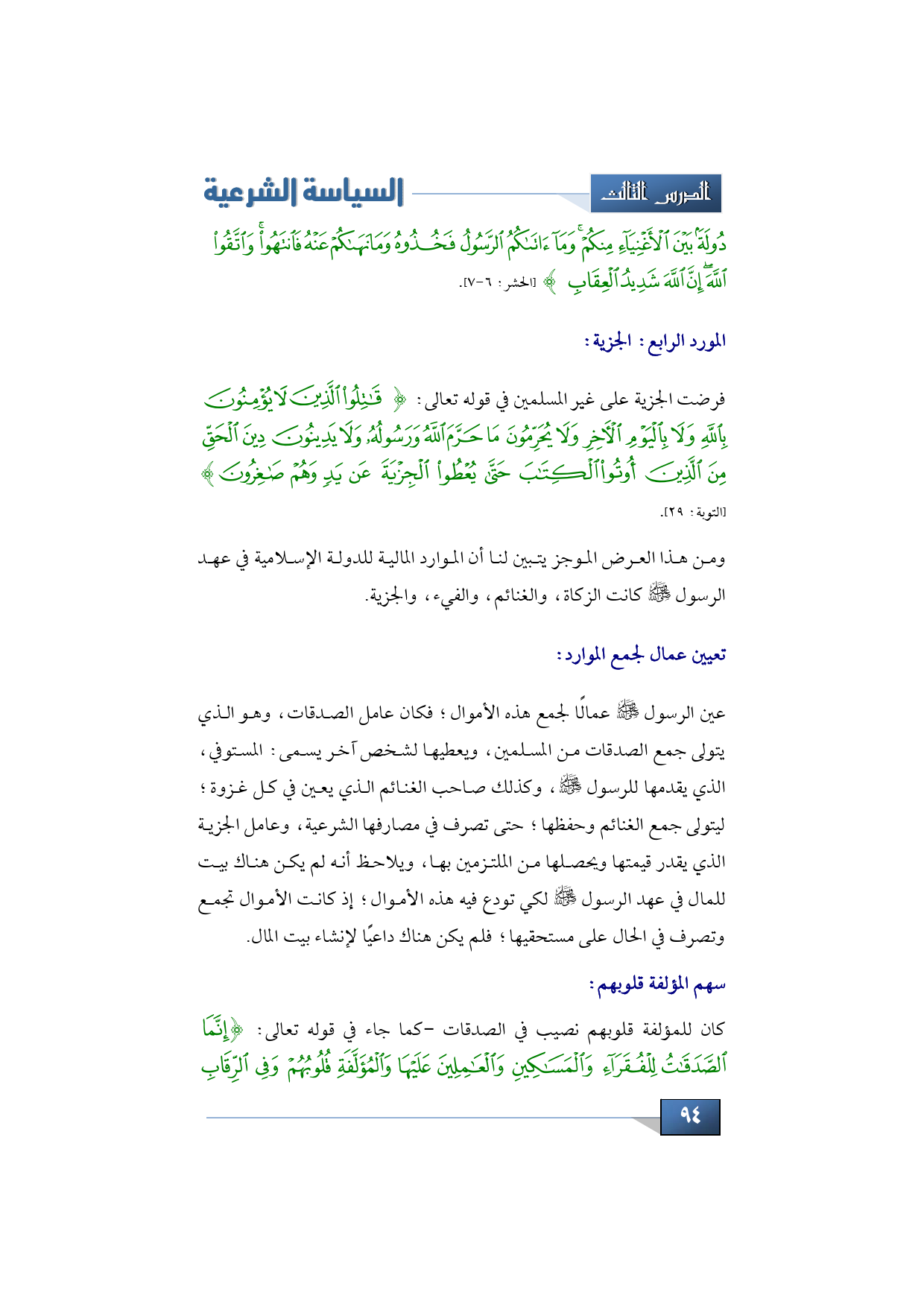 دُولَةً بَيْنَ الأَغْنِيَاءِ مِنْكُمْ وَمَا آتَاكُمْ الرَّسُولُ فَخُذُوهُ وَمَا نَهَاكُمْ عَنْهُ فَانْتَهُوا وَاتَّقُوا اللَّهَ إِنَّ اللَّهَ شَدِيدُ الْعِقَابِ} (الحشر: 6 7).