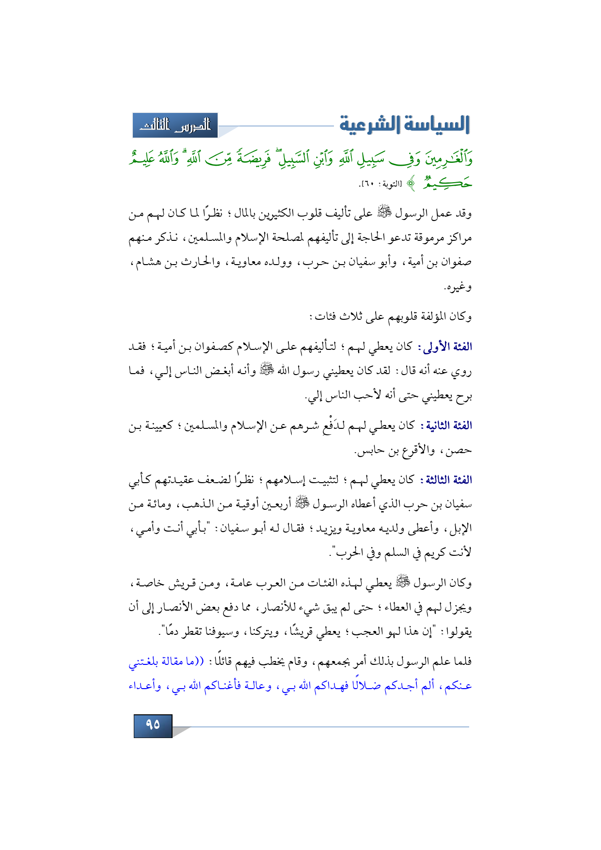الفئة الثالثة: كان يعطي لهم؛ لتثبيت إسلامهم؛ نظرا لضعف عقيدتهم كأبي سفيان بن حرب الذي أعطاه الرسول -صلى الله عليه وسلم- أربعين أوقية من الذهب، ومائة من الإبل، وأعطى ولديه معاوية، ويزيد؛ فقال له أبو سفيان: -بأبي أنت وأمي- "لأنت كريم في السلم وفي الحرب".