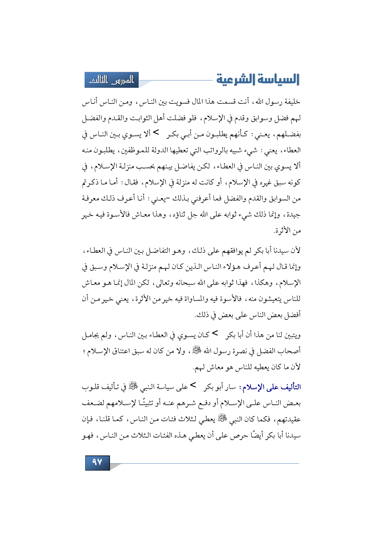 لأن سيدنا أبو بكر لم يوافقهم على ذلك, وهو التفاضل بين الناس في العطاء, وإنما قال لهم أعرف هؤلاء الناس الذين كان لهم منزلة في الإسلام وسبق في الإسلام, وهكذا, فهذا ثوابه على الله سبحانه وتعالى, لكن المال إنما هو معاش للناس يتعيشون منه فالأسوة فيه والمساواة فيه خير من الأثرة, يعني خير من أن أفضل بعض الناس على بعض في ذلك.