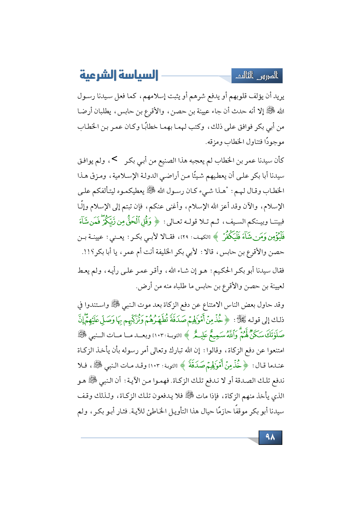 وقد حاول بعض الناس الامتناع عن دفع الزكاة بعد موت النبي -صلى الله عليه وسلم- واستندوا في ذلك إلى قوله -تبارك وتعالى-: {خُذْ مِنْ أَمْوَالِهِمْ صَدَقَةً تُطَهِّرُهُمْ وَتُزَكِّيهِمْ بِهَ} (التوبة: من الآية: 103) وبعد ما مات النبي -صلى الله عليه وسلم- امتنعوا عن دفع الزكاة, لماذا تمتنعون عن دفع الزكاة؟ قالوا: لأن الله تبارك وتعالى أمر رسوله بأن يأخذ الزكاة عندما قال: {خُذْ مِنْ أَمْوَالِهِمْ صَدَقَةً} (التوبة: من الآية: 103) وقد مات النبي -صلى الله عليه وسلم- فلا ندفع تلك الصدقة أو لا ندفع تلك الزكاة. فهموا من الآية: أن النبي -صلى الله عليه وسلم- هو الذي يأخذ منهم الزكاة, فإذا مات -صلى الله عليه وسلم- فلا يدفعون تلك الزكاة, ولذلك وقف سيدنا أبو بكر موقفًا حازمًا حيال هذا التأويل الخاطئ للآية. فثار أبو بكر, ولم