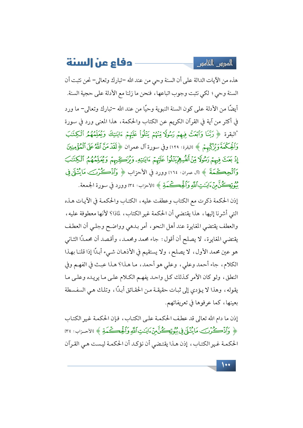 إذن الحكمة ذكرت مع الكتاب وعطفت عليه، الكتاب والحكمة في الآيات هذه التي أشرنا إليها، هذا يقتضي أن الحكمة غير الكتاب، لماذا؟ لأنها معطوفة عليه، والعطف يقتضي المغايرة عند أهل النحو، أمر بدهي وواضح وجلي أن العطف يقتضي المغايرة، لا يصلح أن أقول: جاء محمد ومحمد، وأقصد أن محمدًا الثاني هو عين محمد الأول، لا يصلح، ولا يستقيم في الأذهان شيء أبدًا إذا قلنا بهذا الكلام، جاء أحمد وعلي، وعلي هو أحمد، ما هذا؟ هذا عبث في الفهم وفي النطق، ولو كان الأمر كذلك كل واحد يفهم الكلام على ما يريده وعلى ما يقوله، وهذا لا يؤدي إلى ثبات حقيقة من الحقائق أبدًا، وتلك هي السفسطة بعينها، كما عرفوها في تعريفاتهم.