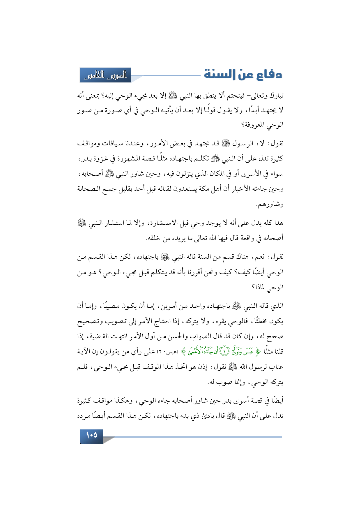 نقول: لا، الرسول -صلى الله عليه وسل م- قد يجتهد في بعض الأمور، وعندنا سياقات ومواقف كثيرة تدل على أن النبي -صلى الله عليه وسل م- تكلم باجتهاده مثلًا قصة المشهورة في غزوة بدر، سواء في الأسرى أو في المكان الذي ينزلون فيه، الحباب بن المنذر، وحين شاور النبي -صلى الله عليه وسل م- أصحابه، وحين جاءته الأخبار أن أهل مكة يستعدون لقتاله قبل أحد بقليل جمع الصحابة وشاورهم.