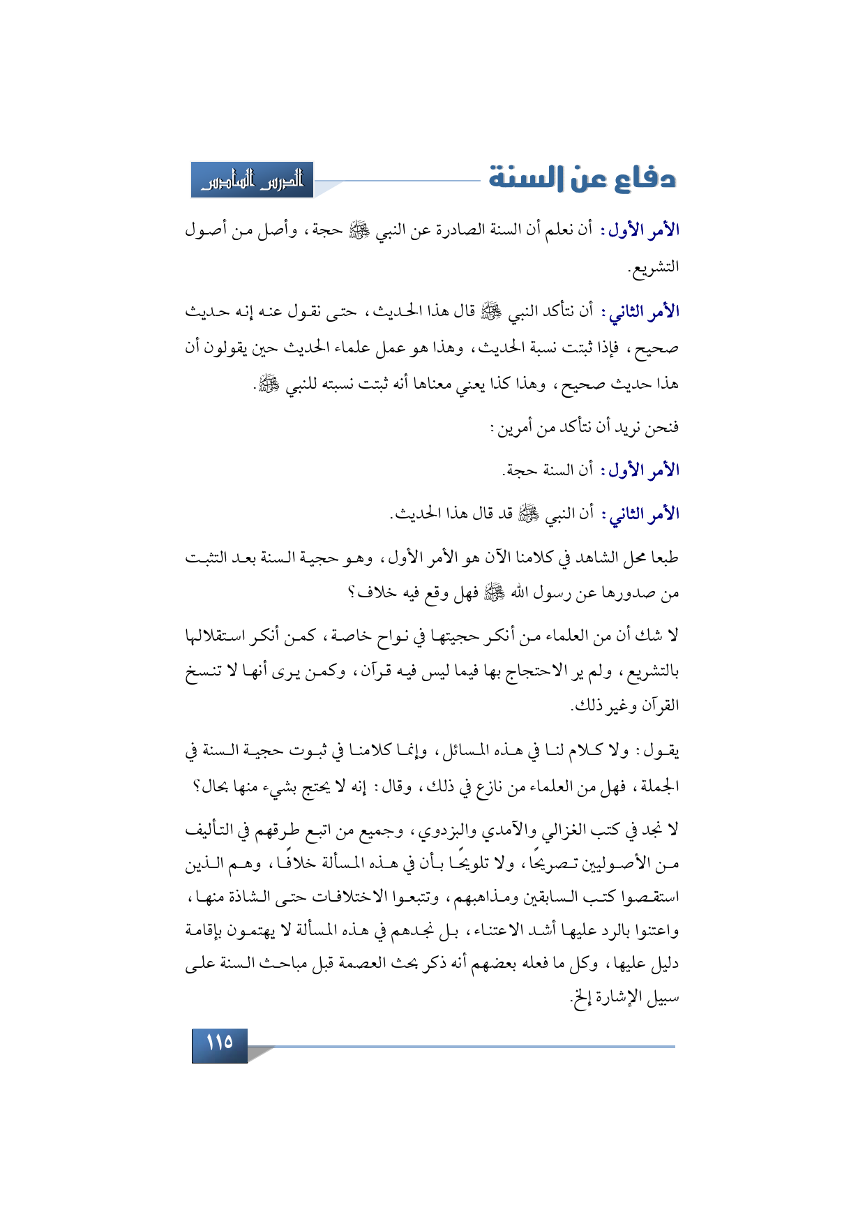 فنحن نريد أن نتأكد من أمرين: الأمر الأول: أن السنة حجة. والأمر الثاني: أن النبي -صلى الله عليه وسل م- قد قال هذا الحديث.