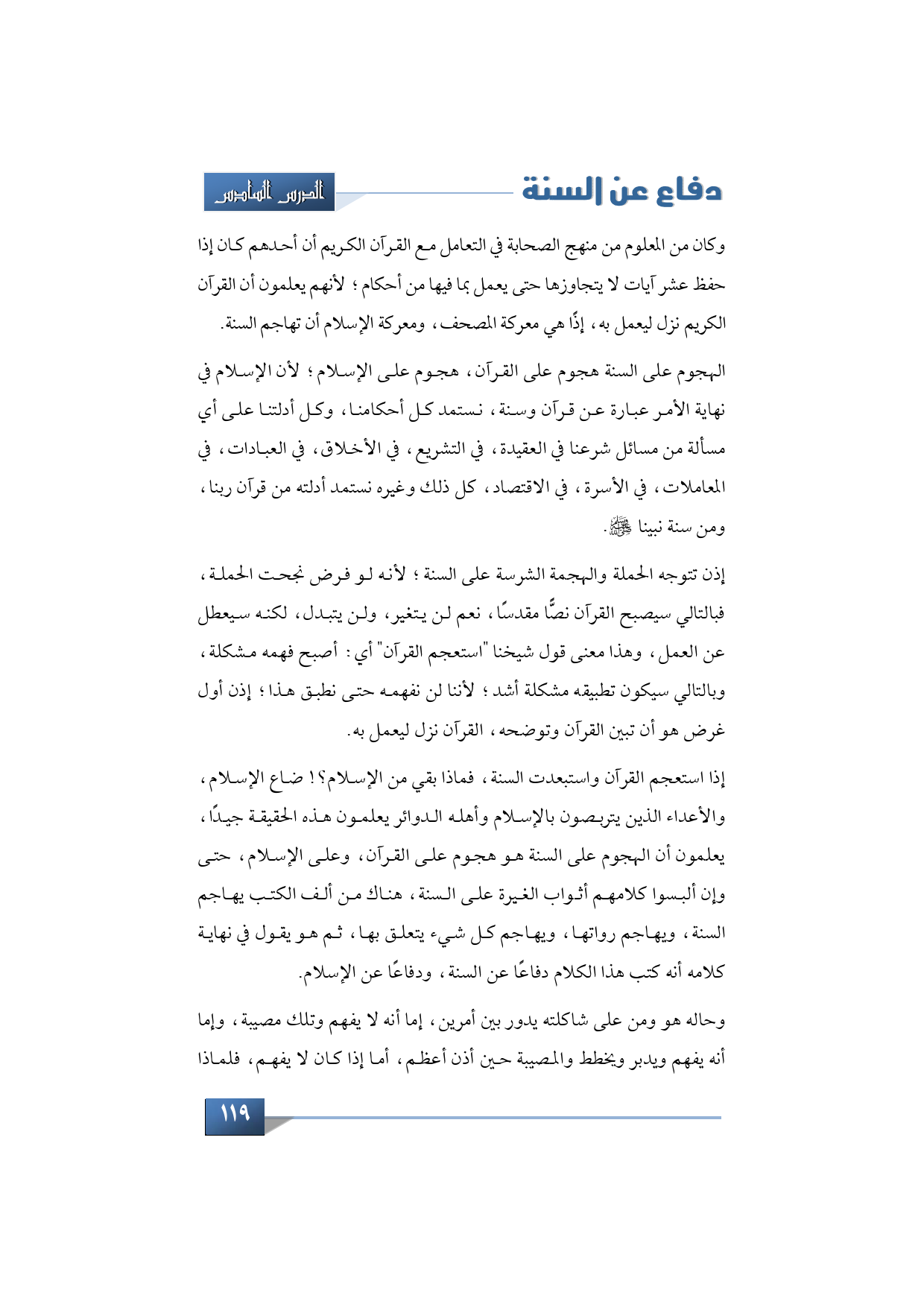 وكان من المعلوم من منهج الصحابة في التعامل مع القرآن الكريم أن أحدهم كان إذا حفظ عشر آيات لا يتجاوزها حتى يعمل بما فيها من أحكام؛ لأنهم يعلمون أن القرآن الكريم نزل ليعمل به، إذًا هي معركة المصحف، ومعركة الإسلام أن تهاجم السنة.