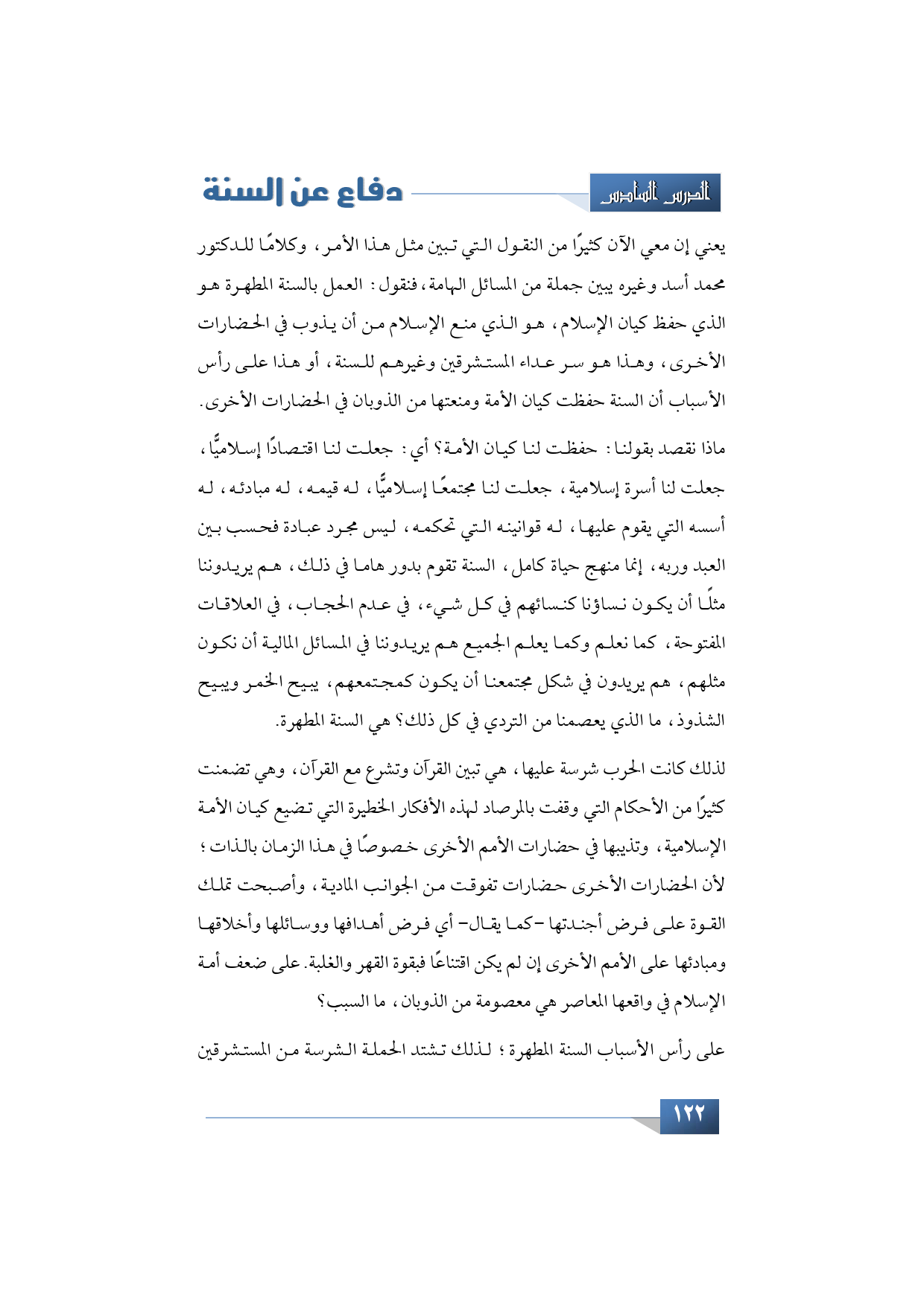 يعني إن معي الآن كثيرًا من النقول التي تبين مثل هذا الأمر، وكلامًا للدكتور محمد أسد وغيره يبين جملة من المسائل الهامة، يعني نقول: العمل بالسنة المطهرة هو الذي حفظ كيان الإسلام، هو الذي منع الإسلام من أن يذوب في الحضارات الأخرى، وهذا هو سر عداء المستشرقين وغيرهم للسنة، أو هذا على رأس الأسباب أن السنة حفظت كيان الأمة ومنعتها من الذوبان في الحضارات الأخرى.
