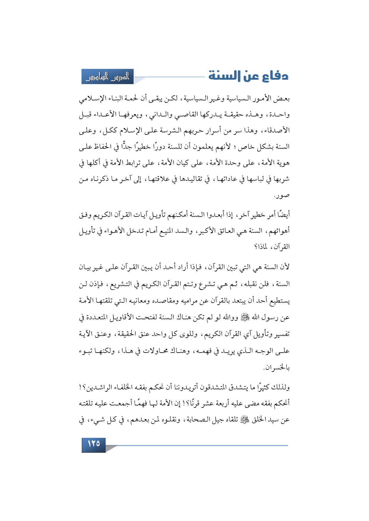 بعض الأمور السياسية وغير السياسية، لكن يبقى أن لحمة البناء الإسلامي واحدة، وهذه حقيقة يدركها القاصي والداني، ويعرفها الأعداء قبل الأصدقاء، وهذا سر من أسرار حربهم الشرسة على الإسلام ككل، وعلى السنة بشكل خاص؛ لأنهم يعلمون أن للسنة دورًا خطيرًا جدًّا في الحفاظ على هوية الأمة، على وحدة الأمة، على كيان الأمة، على ترابط الأمة في أكلها في شربها في لباسها في عاداتها، في تقاليدها في علاقتها إلى آخر ما ذكرناه من صور.