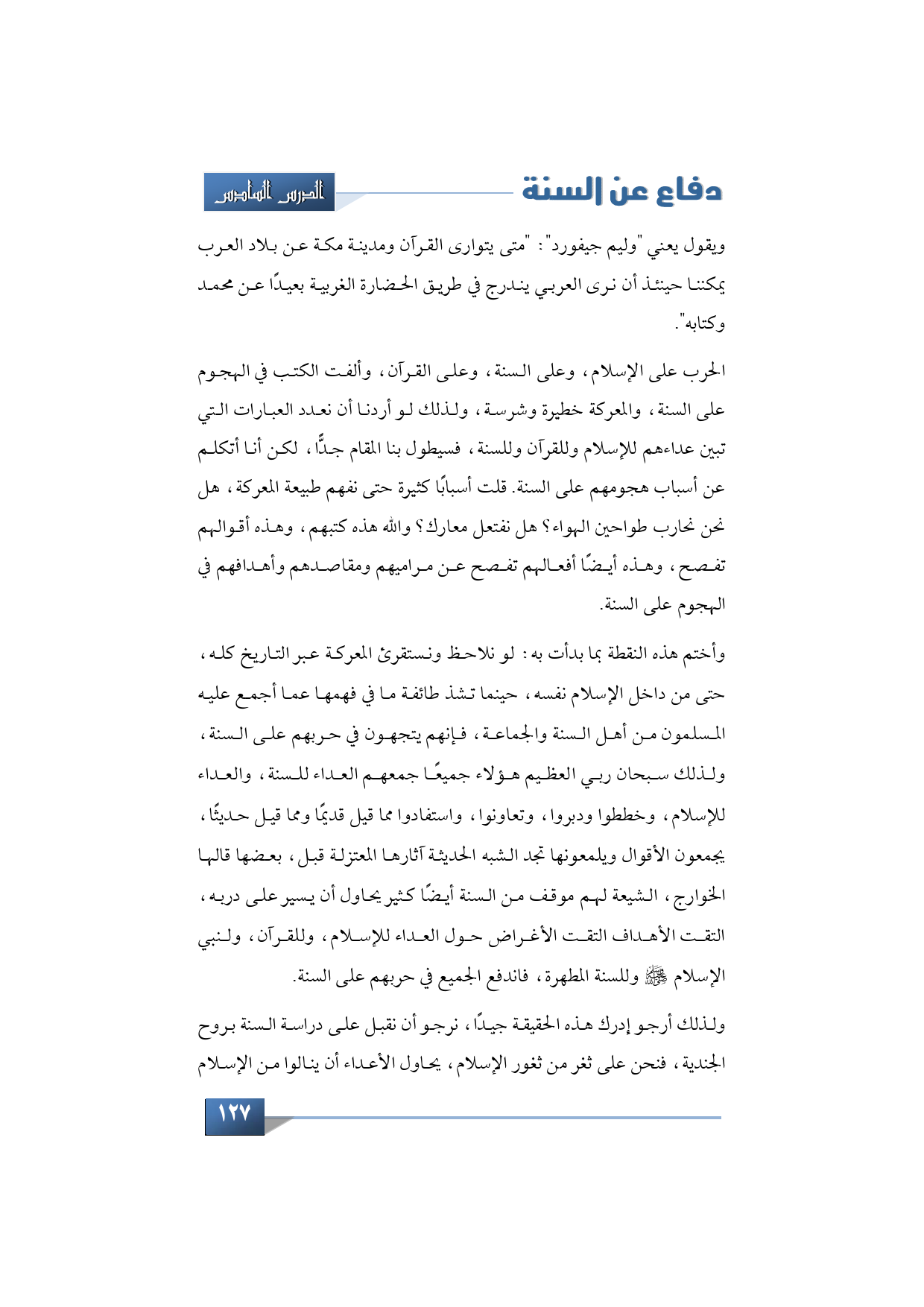 الحرب على الإسلام، وعلى السنة، وعلى القرآن، وألفت الكتب في الهجوم على السنة، والمعركة خطيرة وشرسة، ولذلك لو أردنا أن نعدد العبارات التي تبين عداءهم للإسلام وللقرآن وللسنة، فسيطول بنا المقام جدًّا، لكن أنا أتكلم عن أسباب هجومهم على السنة. قلت أسبابًا كثيرة حتى نفهم طبيعة المعركة، هل نحن نحارب طواحين الهواء؟ هل نفتعل معارك؟ والله هذه كتبهم، وهذه أقوالهم تفصح، وهذه أيضًا أفعالهم تفصح عن مراميهم ومقاصدهم وأهدافهم في الهجوم على السنة.