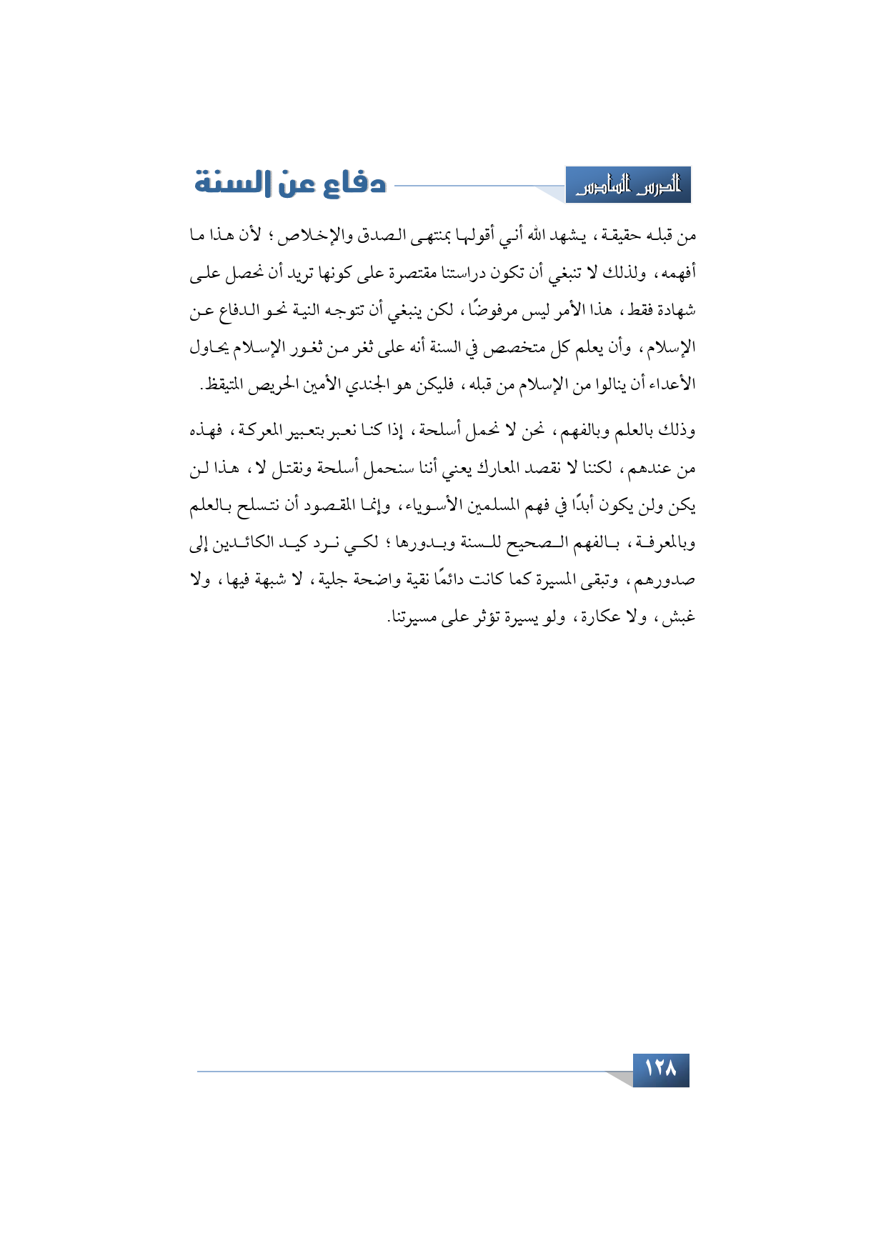 وذلك بالعلم وبالفهم، نحن لا نحمل أسلحة، إذا كنا نعبر بتعبير المعركة، فهذه من عندهم، لكننا لا نقصد المعارك يعني أننا سنحمل أسلحة ونقتل، لا والله، هذا لن يكن ولن يكون أبدًا في فهم المسلمين الأسوياء، وإنما المقصود أن نتسلح بالعلم وبالمعرفة، بالفهم الصحيح للسنة وبدورها؛ لكي نرد كيد الكائدين إلى صدورهم، وتبقى المسيرة كما كانت دائمًا نقية واضحة جلية، لا شبهة فيها، ولا غبش، ولا عكارة، ولو يسيرة تؤثر على مسيرتنا.
