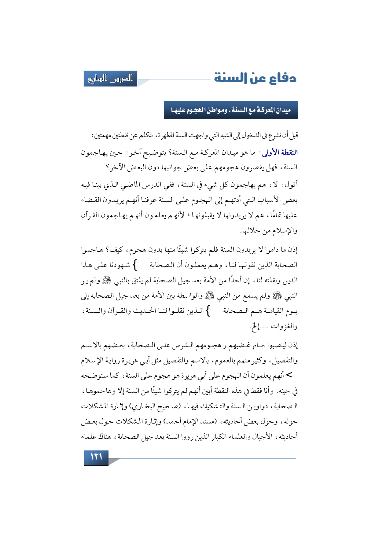 أنا فقط في هذه النقطة أبين أنهم لم يتركوا شيئًا من السنة إلا وهاجموها، الصحابة، دواوين السنة والتشكيك فيها، (صحيح البخاري) وإثارة المشكلات حوله، وحول بعض أحاديثه، (مسند الإمام أحمد) وإثارة المشكلات حول بعض أحاديثه، الأجيال والعلماء الكبار الذين رووا السنة بعد جيل الصحابة، هناك علماء