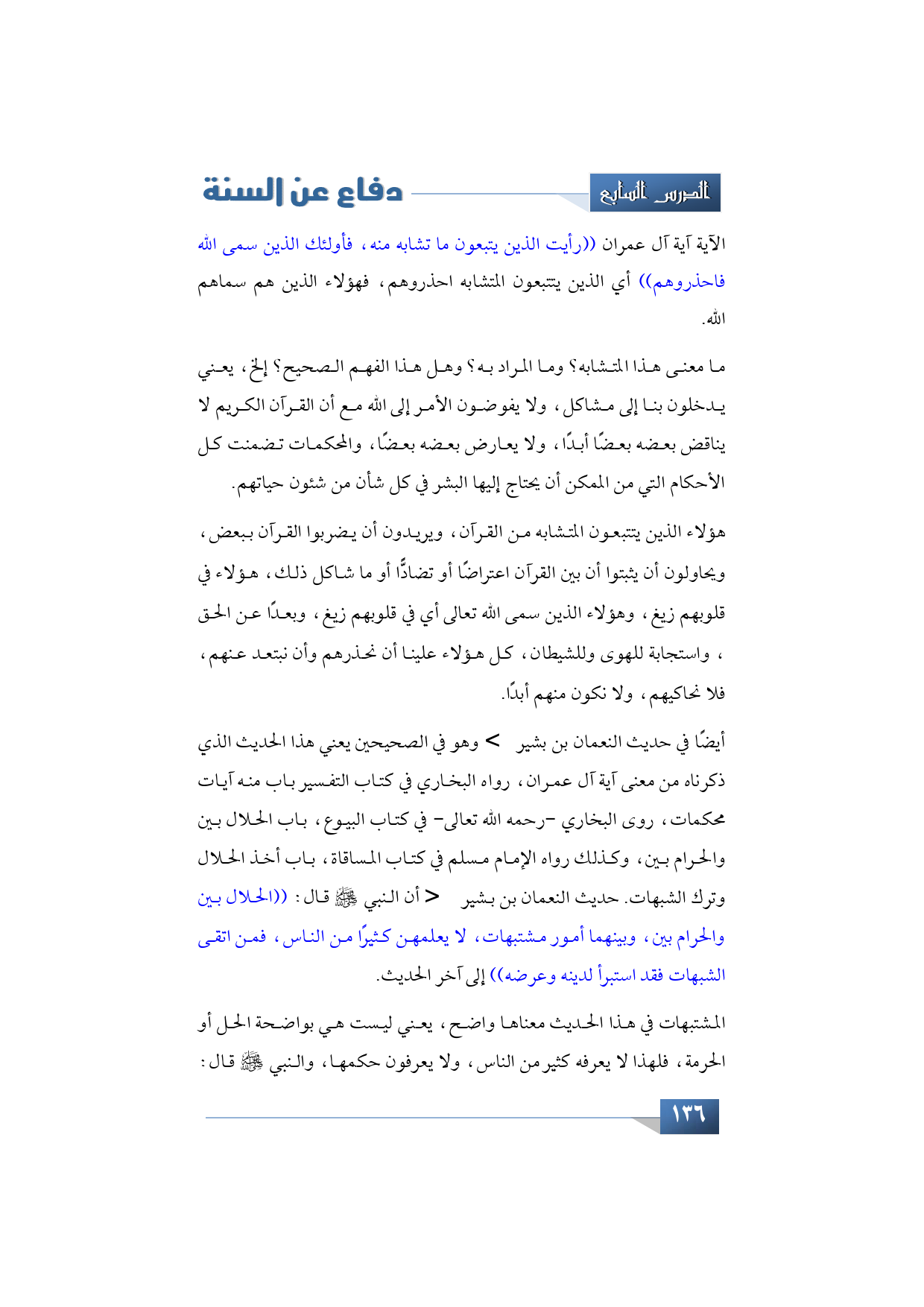 أيضًا في حديث النعمان بن بشير -رضي الله عنه- وهو في الصحيحين يعني هذا الحديث الذي ذكرناه من معنى آية آل عمران، رواه البخاري في كتاب التفسير باب منه آيات محكمات، روى البخاري -رحمه الله تعالى- في كتاب البيوع، باب الحلال بين والحرام بين، وكذلك رواه الإمام مسلم في كتاب المساقاة، باب أخذ الحلال وترك الشبهات. حديث النعمان بن بشير -رضي الله تعالى عنهما- أن النبي -صلى الله عليه وسلم- قال: ((الحلال بين والحرام بين، وبينهما أمور مشتبهات، لا يعلمهن كثيرًا من الناس، فمن اتقى الشبهات فقد استبرأ لدينه وعرضه)) إلى آخر الحديث.
