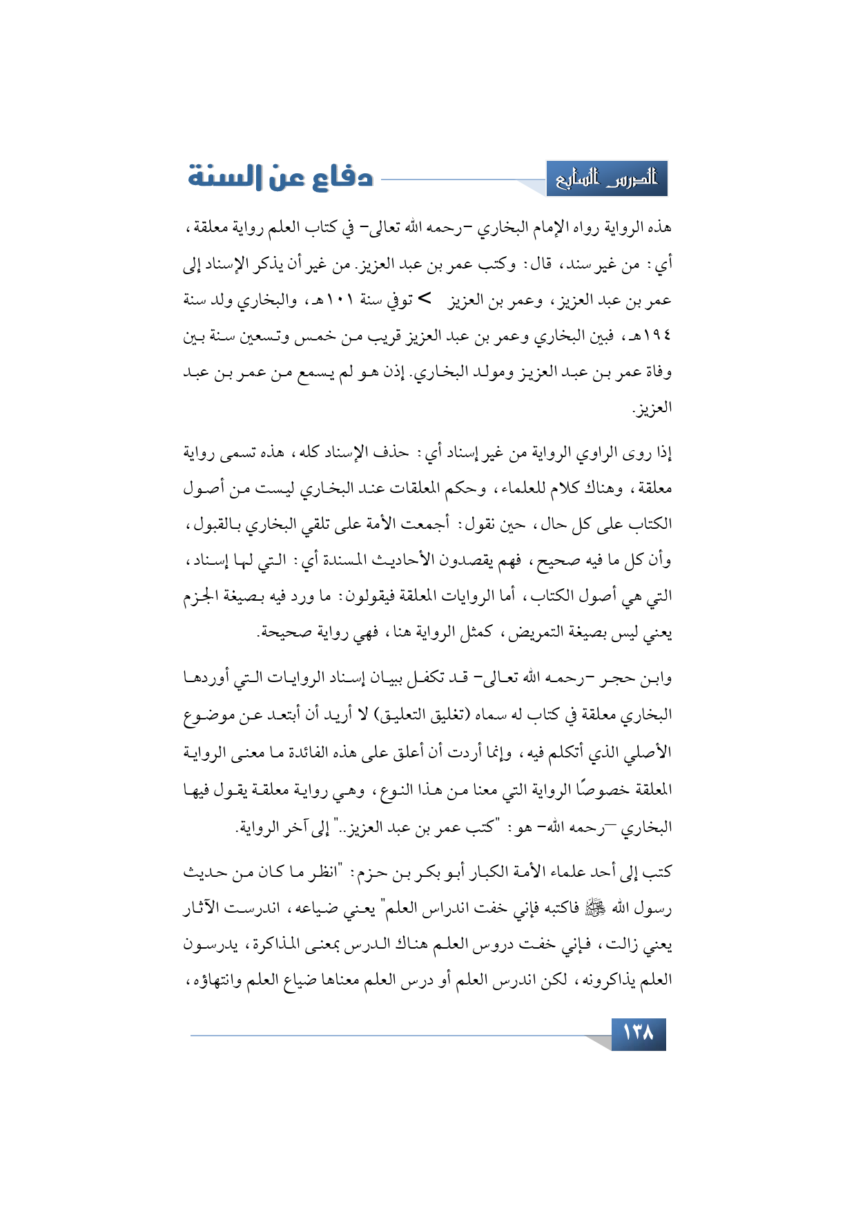 هذه الرواية رواه الإمام البخاري -رحمه الله تعالى- في كتاب العلم رواية معلقة، يعني من غير سند، قال: وكتب عمر بن عبد العزيز. من غير أن يذكر الإسناد إلى عمر بن عبد العزيز، وعمر بن العزيز -رحمه الله تعالى- ورضي الله تعالى عنه توفي سنة 101هـ، والبخاري ولد سنة 194هـ، فبين البخاري وعمر بن عبد العزيز قريب من خمس وتسعين سنة بين وفاة عمر بن عبد العزيز ومولد البخاري. إذن هو لم يسمع من عمر بن عبد العزيز.