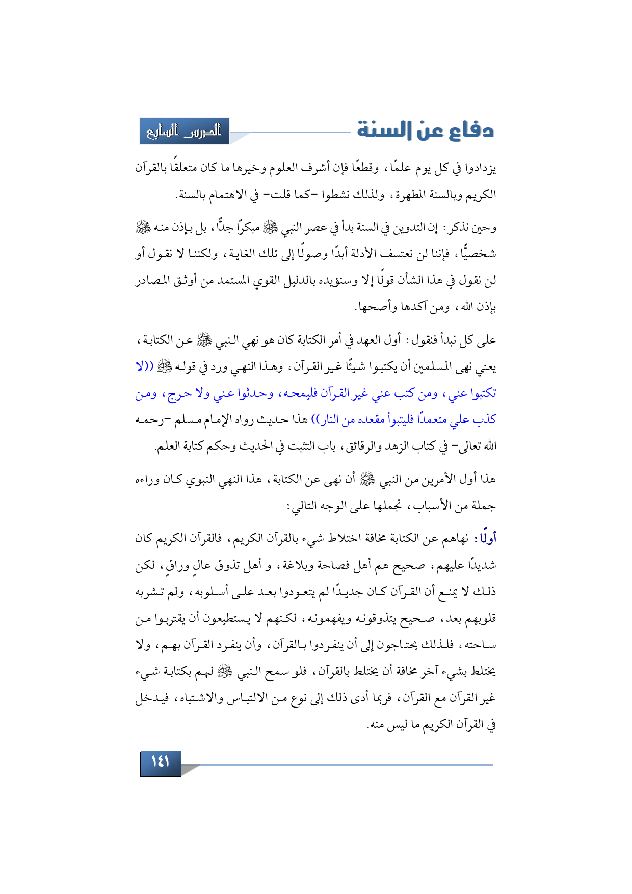 هذا أول الأمرين من النبي -صلى الله عليه وسلم- أن نهى عن الكتابة، هذا النهي النبوي كان وراءه جملة من الأسباب، نجملها على الوجه التالي: