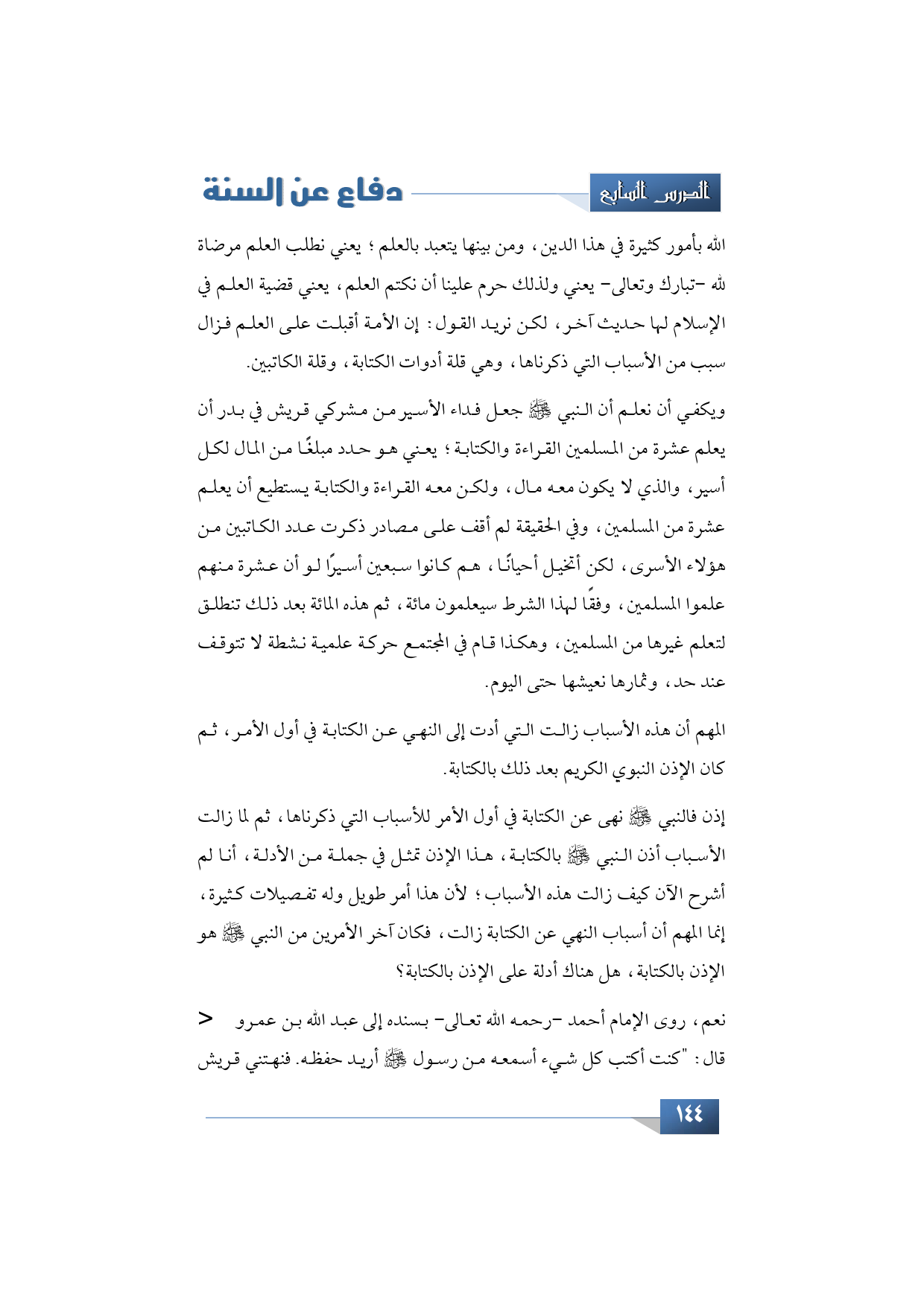 الله بأمور كثيرة في هذا الدين، ومن بينها يتعبد بالعلم؛ يعني نطلب العلم مرضاة لله -تبارك وتعالى- يعني ولذلك حرم علينا أن نكتم العلم، يعني قضية العلم في الإسلام لها حديث آخر، لكن أنا أريد أن أقول: إن الأمة أقبلت على العلم فزال سبب من الأسباب التي ذكرناها، وهي قلة أدوات الكتابة، وقلة الكاتبين.