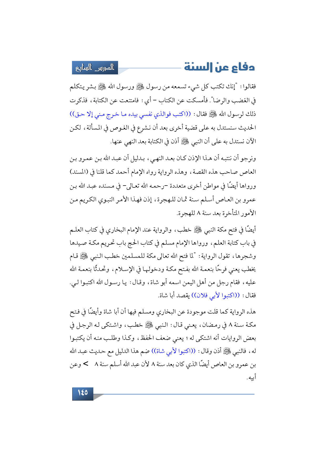 هذه الرواية كما قلت موجودة عن البخاري ومسلم فيها أن أبا شاة وأيضًا في فتح مكة سنة 8 في رمضان، يعني قال: النبي -صلى الله عليه وسلم- خطب، واشتكى له الرجل في بعض الروايات أنه اشتكى له؛ يعني ضعف الحفظ، وكذا وطلب منه أن يكتبوا له، فالنبي -صلى الله عليه وسلم- أذن وقال: ((اكتبوا لأبي شاة)) ضم هذا الدليل مع حديث عبد الله بن عمرو بن العاص أيضًا الذي كان بعد سنة 8 لأن عبد الله أسلم سنة 8 - رضي الله عنه- وعن أبيه.