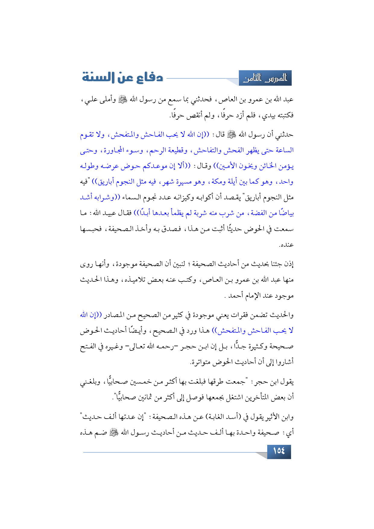 إذن يعني جئنا بحديث من أحاديث الصحيفة لنبين أن الصحيفة موجودة، وأنها روى منها عبد الله بن عمرو بن العاص، وكتب عنه بعض تلاميذه، وهذا الحديث موجود عند الإمام أحمد.