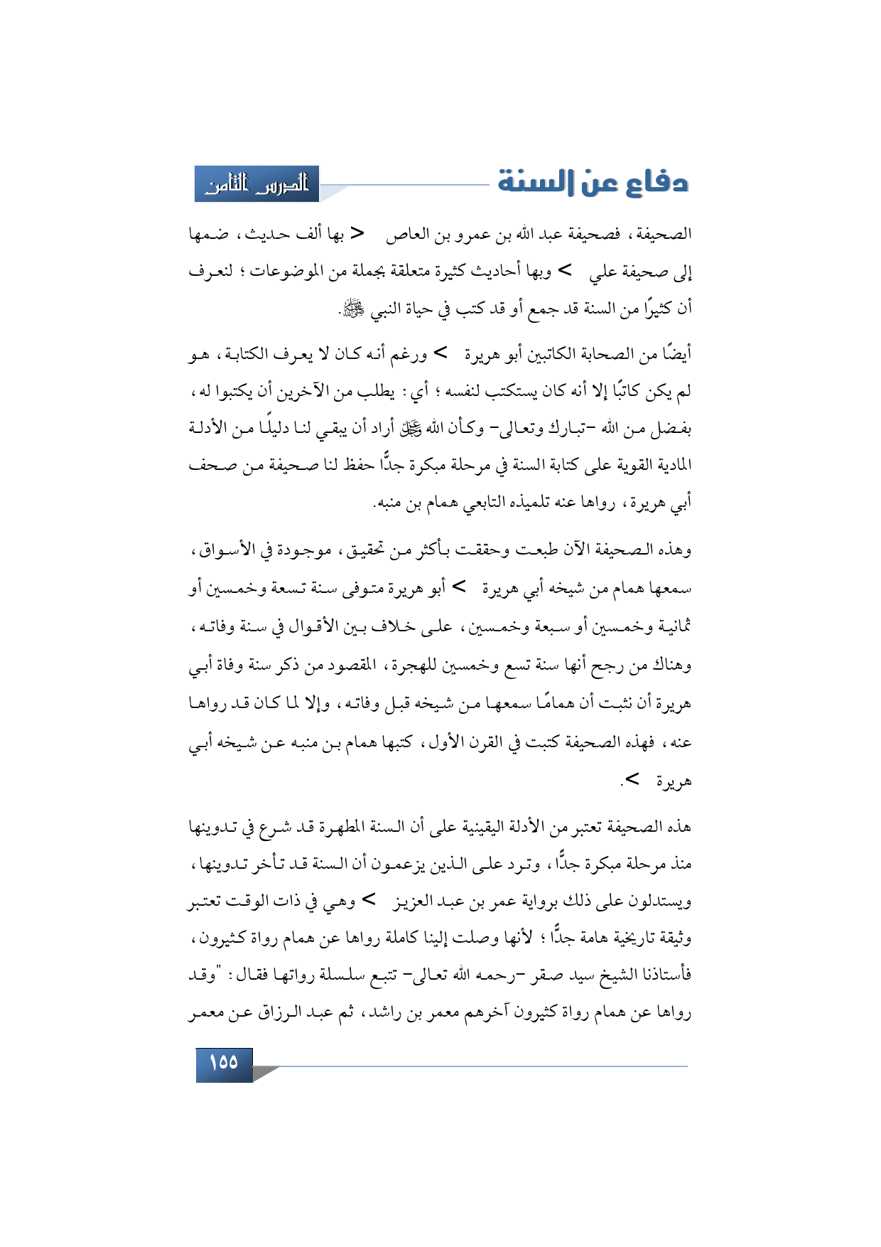 الصحيفة، فصحيفة عبد الله بن عمرو بن العاص -رضي الله تعالى عنهما- بها ألف حديث، ضمها إلى صحيفة علي -رضي الله عنه- وبها أحاديث كثيرة متعلقة بجملة من الموضوعات؛ لنعرف أن كثيرًا من السنة قد جمع أو قد كتب في حياة النبي -صلى الله عليه وسلم-.