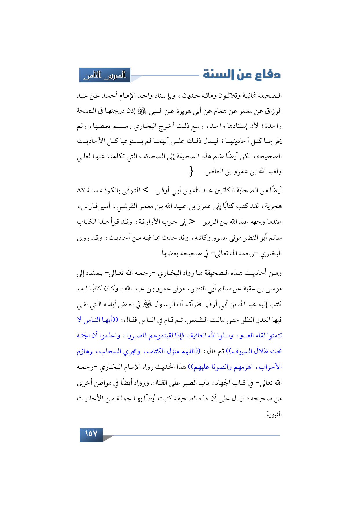 ومن أحاديث هذه الصحيفة ما رواه البخاري -رحمه الله تعالى- بسنده إلى موسى بن عقبة عن سالم أبي النضر، مولى عمرو بن عبد الله، وكان كاتبًا له، كتب إليه عبد الله بن أبي أوفى فقرأته أن الرسول -صلى الله عليه وسلم- في بعض أيامه التي لقي فيها العدو انتظر حتى مالت الشمس. ثم قام في الناس فقال: ((أيها الناس لا تتمنوا لقاء العدو، وسلوا الله العافية، فإذا لقيتموهم فاصبروا، واعلموا أن الجنة تحت ظلال السيوف)) ثم قال: ((اللهم منزل الكتاب، ومجري السحاب، وهازم الأحزاب، اهزمهم وانصرنا عليهم)) هذا الحديث رواه الإمام البخاري -رحمه الله تعالى- في كتاب الجهاد، باب الصبر على القتال. ورواه أيضًا في مواطن أخرى من صحيحه؛ ليدل على أن هذه الصحيفة كتبت أيضًا بها جملة من الأحاديث النبوية.