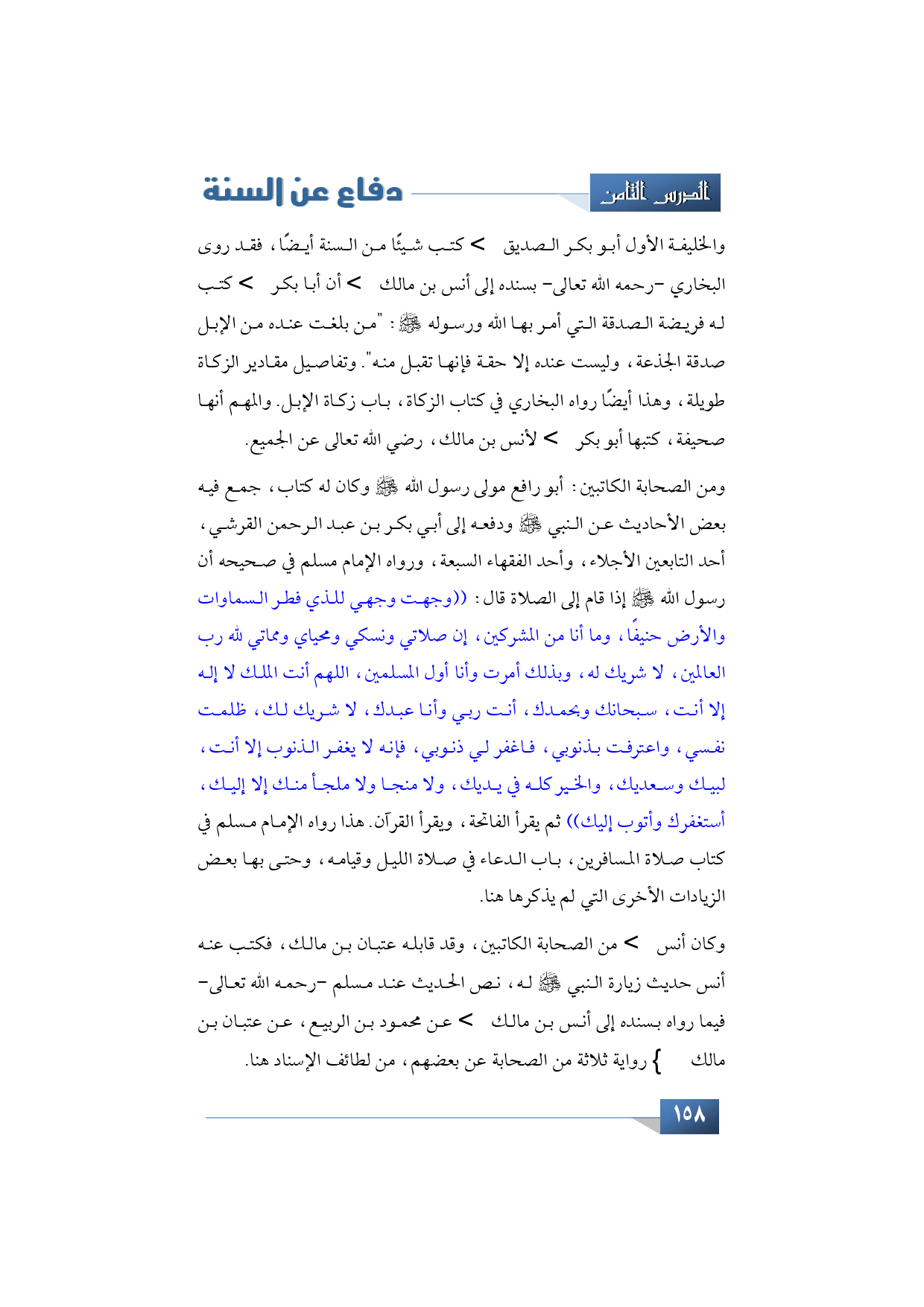 ومن الصحابة الكاتبين أبو رافع مولى رسول الله -صلى الله عليه وسلم- وكان له كتاب، جمع فيه بعض الأحاديث عن النبي -صلى الله عليه وسلم- ودفعه إلى أبي بكر بن عبد الرحمن القرشي، أحد التابعين الأجلاء، وأحد الفقهاء السبعة، ورواه الإمام مسلم في صحيحه أن رسول الله -صلى الله عليه وسلم- إذا قام إلى الصلاة قال: ((وجهت وجهي للذي فطر السماوات والأرض حنيفًا، وما أنا من المشركين، إن صلاتي ونسكي ومحياي ومماتي لله رب العالمين، لا شريك له، وبذلك أمرت وأنا أول المسلمين، اللهم أنت الملك لا إله إلا أنت، سبحانك وبحمدك، أنت ربي وأنا عبدك، لا شريك لك، ظلمت نفسي، واعترفت بذنوبي، فاغفر لي ذنوبي، فإنه لا يغفر الذنوب إلا أنت، لبيك وسعديك، والخير كله في يديك، ولا منجا ولا ملجأ منك إلا إليك، أستغفرك وأتوب إليك)) ثم يقرأ. يعني يقرأ الفاتحة، ويقرأ القرآن. هذا رواه الإمام مسلم في كتاب صلاة المسافرين، باب الدعاء في صلاة الليل وقيامه، وحتى بها بعض الزيادات الأخرى التي لم يذكرها هنا.