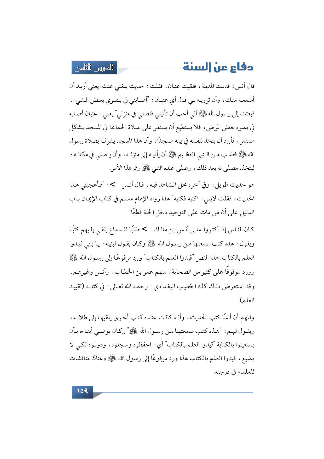 كان الناس إذا أكثروا على أنس بن مالك -رضي الله عنه- طلبًا للسماع يلقي إليهم كتبًا ويقول: هذه كتب سمعتها من رسول الله -صلى الله عليه وسلم- وكان يقول لبنيه: يا بني قيدوا العلم بالكتاب. هذا النص "قيدوا العلم بالكتاب" ورد مرفوعًا إلى رسول الله -صلى الله عليه وسلم- وورد موقوفًا على كثير من الصحابة، منهم عمر بن الخطاب، وأنس وغيرهم، وقد استعرض ذلك كله الخطيب البغدادي -رحمه الله تعالى- في كتابه (تقييد العلم).
