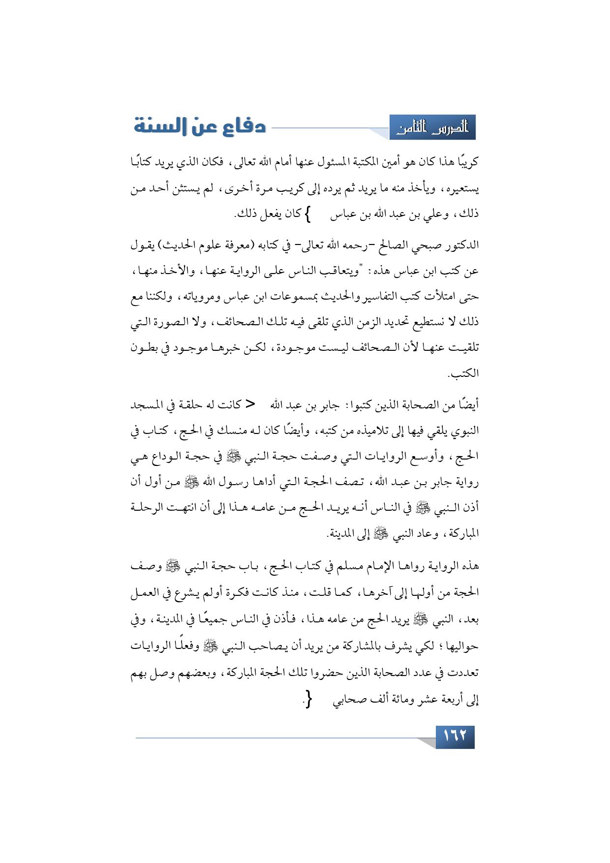 أيضًا من الصحابة الذين كتبوا: جابر بن عبد الله -رضي الله تعالى عنهما- كانت له حلقة في المسجد النبوي يلقي فيها إلى تلاميذه من كتبه، وأيضًا كان له منسك في الحج، كتاب في الحج، وأوسع الروايات التي وصفت حجة النبي -صلى الله عليه وسلم- في حجة الوداع هي رواية جابر بن عبد الله، تصف الحجة التي أداها رسول الله -صلى الله عليه وسلم- من أول أن أذن النبي -صلى الله عليه وسلم- في الناس أنه يريد الحج من عامه هذا إلى أن انتهت الرحلة المباركة، وعاد النبي -صلى الله عليه وسلم- إلى المدينة.