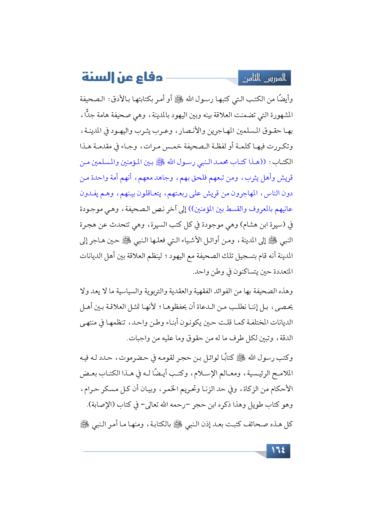 وأيضًا من الكتب التي كتبها رسول الله -صلى الله عليه وسلم- أو أمر بكتابتها بالأدق: الصحيفة المشهورة التي تضمنت العلاقة بينه وبين اليهود بالمدينة، وهي صحيفة هامة جدًّا، بها حقوق المسلمين المهاجرين والأنصار، وعرب يثرب واليهود في المدينة، وتكررت فيها كلمة أو لفظة الصحيفة خمس مرات، وجاء في مقدمة هذا الكتاب: ((هذا كتاب محمد النبي رسول الله -صلى الله عليه وسلم- بين المؤمنين والمسلمين من قريش وأهل يثرب، ومن تبعهم فلحق بهم، وجاهد معهم، أنهم أمة واحدة من دون الناس، المهاجرون من قريش على ربعتهم، يتعاقلون بينهم، وهم يفدون عانيهم بالمعروف والقسط بين المؤمنين)) إلى آخر نص الصحيفة، وهي موجودة في (سيرة ابن هشام) وهي موجودة في كل كتب السيرة، وهي تتكلم عن هجرة النبي -صلى الله عليه وسلم- إلى المدينة، ومن أوائل الأشياء التي فعلها النبي -صلى الله عليه وسلم- حين هاجر إلى المدينة أنه قام بتسجيل تلك الصحيفة مع اليهود؛ لينظم العلاقة بين أهل الديانات المتعددة حين يتساكنون في وطن واحد.