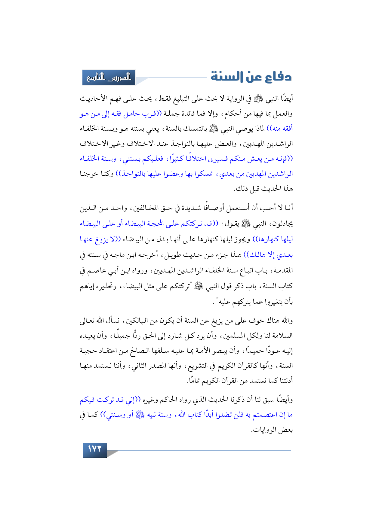 أيضًا النبي -صلى الله عليه وسلم- في الرواية لا يحث على التبليغ فقط، يحث على فهم الأحاديث والعمل بما فيها من أحكام، وإلا فما فائدة جملة ((فرب حامل فقه إلى من هو أفقه منه)) لماذا يوصي النبي -صلى الله عليه وسلم- بالتمسك بالسنة، يعني بسنته هو وبسنة الخلفاء الراشدين المهديين، والعض عليها بالنواجذ عند الاختلاف وغير الاختلاف ((فإنه من يعش منكم فسيرى اختلافًا كثيرًا، فعليكم بسنتي، وسنة الخلفاء الراشدين المهديين من بعدي، تمسكوا بها وعضوا عليها بالنواجذ)) وكنا خرجنا هذا الحديث قبل ذلك.