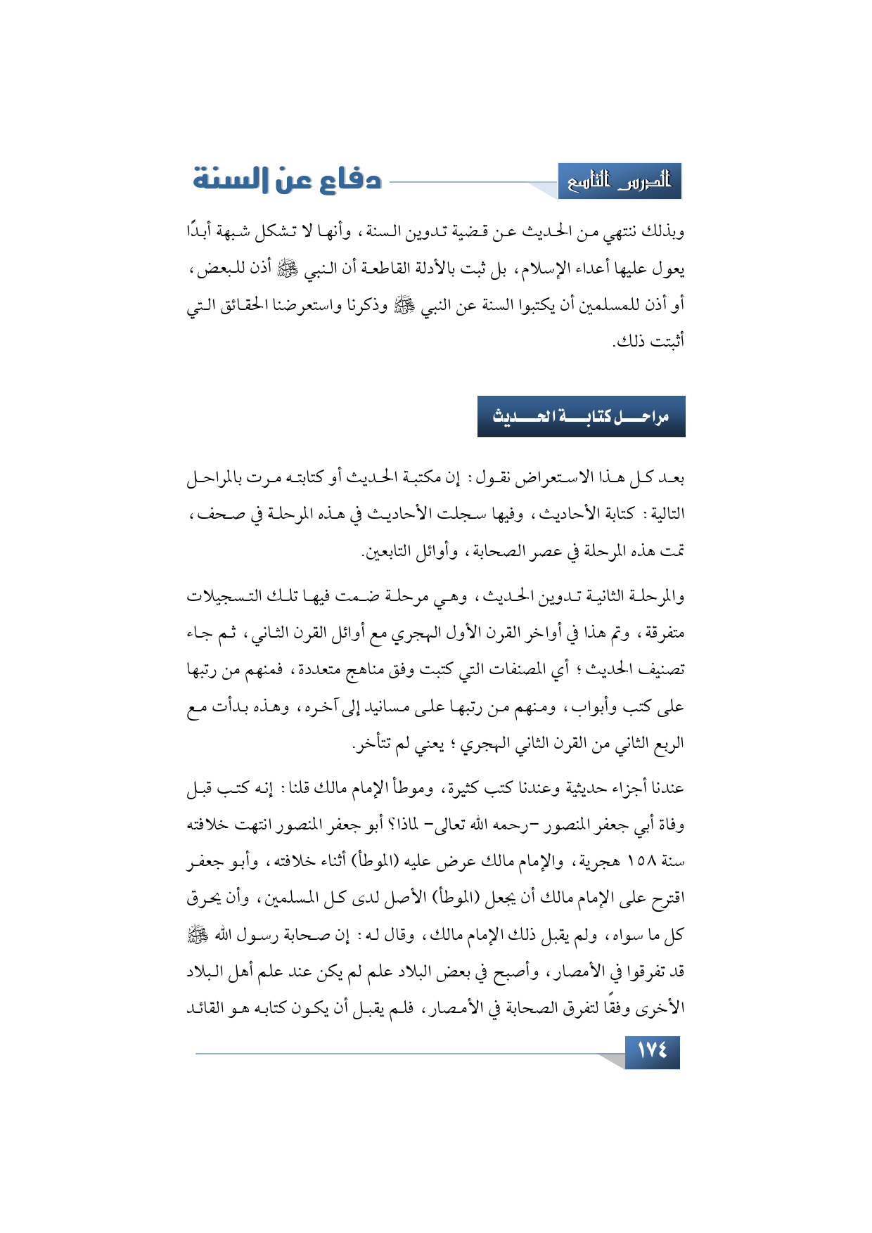 وبذلك ننتهي من الحديث عن قضية تدوين السنة، وأنها لا تشكل شبهة أبدًا يعول عليها أعداء الإسلام، بل ثبت بالأدلة القاطعة أن النبي -صلى الله عليه وسلم- أذن للبعض، أو أذن للمسلمين أن يكتبوا السنة عن النبي -صلى الله عليه وسلم- وذكرنا واستعرضنا الحقائق التي أثبتت ذلك.