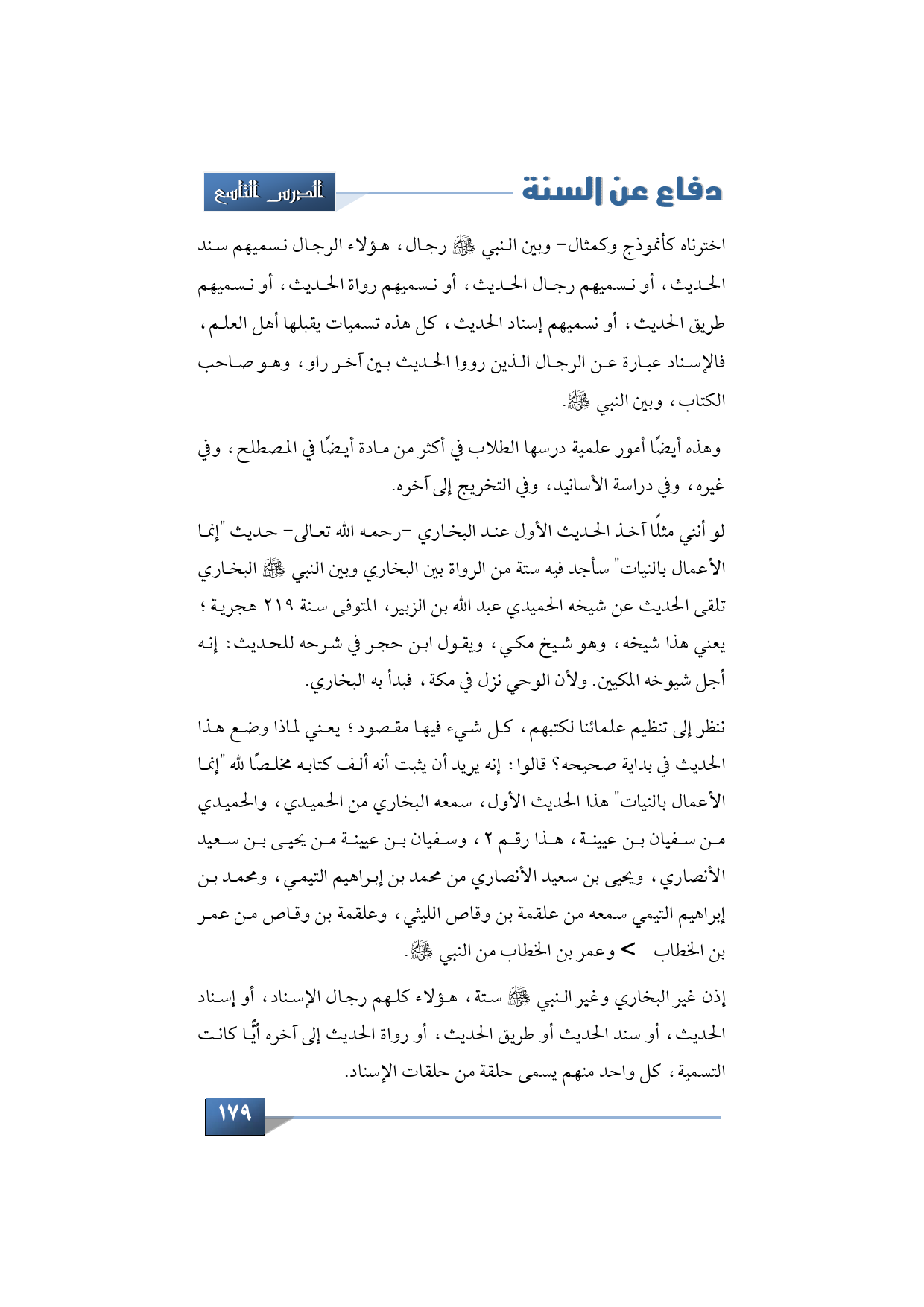 ننظر إلى تنظيم علمائنا لكتبهم، كل شيء فيها مقصود؛ يعني لماذا وضع هذا الحديث في بداية صحيحه؟ قالوا: إنه يريد أن يثبت أنه ألف كتابه مخلصًا لله "إنما الأعمال بالنيات" هذا الحديث الأول، سمعه البخاري من الحميدي، والحميدي من سفيان بن عيينة، هذا رقم 2، وسفيان بن عيينة من يحيى بن سعيد الأنصاري، ويحيى بن سعيد الأنصاري من محمد بن إبراهيم التيمي، ومحمد بن إبراهيم التيمي سمعه من علقمة بن وقاص الليثي، وعلقمة بن وقاص من عمر بن الخطاب -رضي الله تعالى عنه- وعمر بن الخطاب من النبي -صلى الله عليه وسلم-.