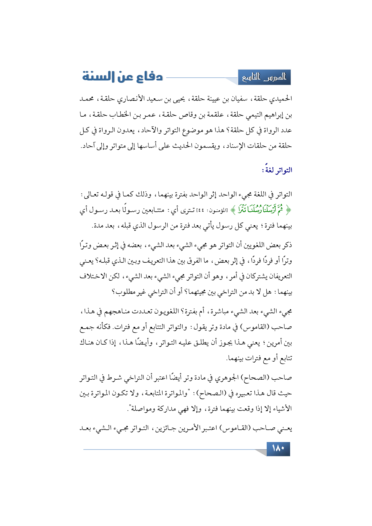 التواتر في اللغة مجيء الواحد إثر الواحد بفترة بينهما، وذلك كما في قوله تعالى: {ثُمَّ أَرْسَلْنَا رُسُلَنَا تَتْرَى} (المؤمنون: 44) تترى أي: متتابعين رسولًا بعد رسول يعني بينهما فترة؛ يعني كل رسول يأتي بعد فترة من الرسول الذي قبله، بعد مدة.