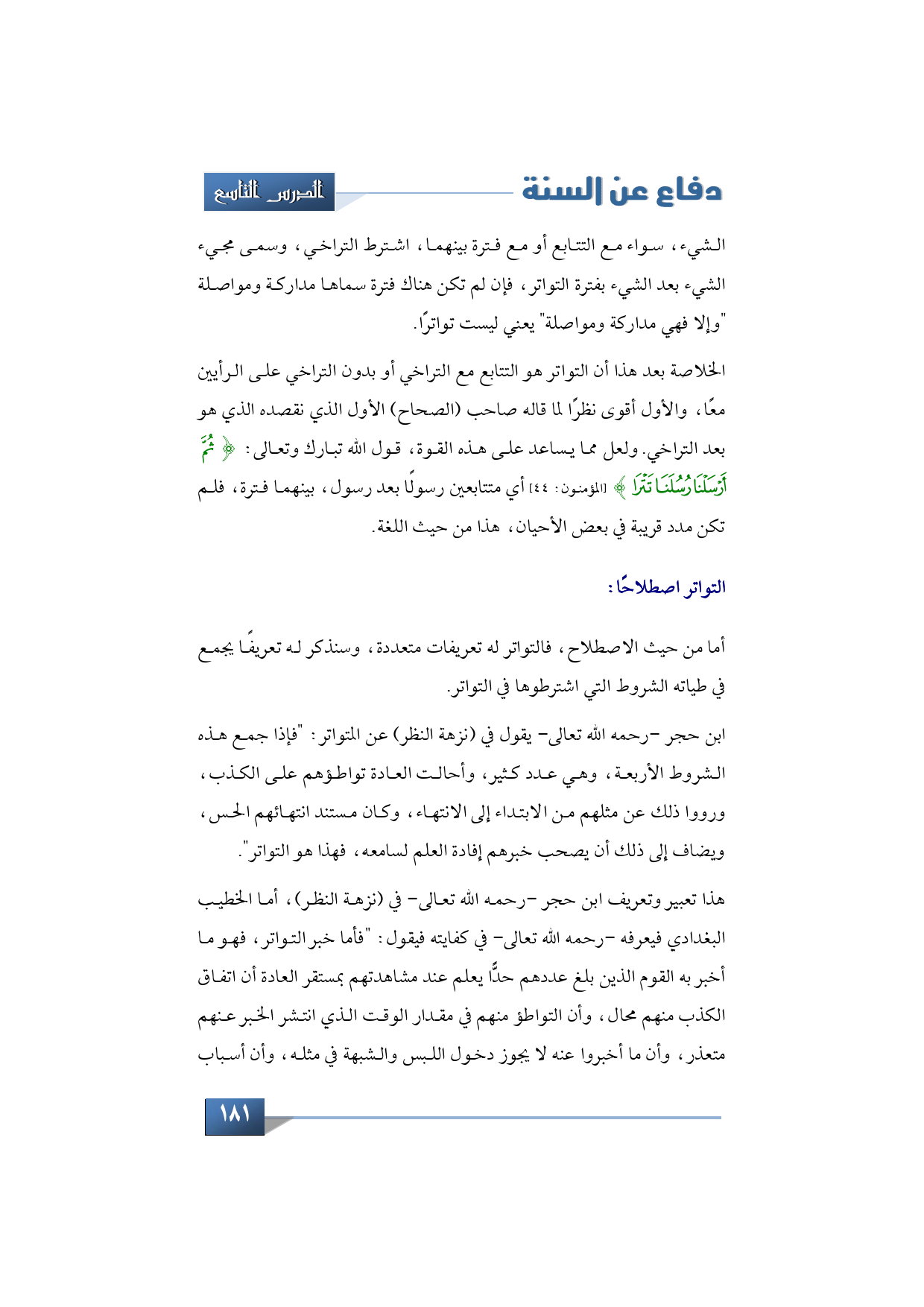الخلاصة بعد هذا أن التواتر هو التتابع مع التراخي أو بدون التراخي على الرأيين معًا، والأول أقوى نظرًا لما قاله صاحب (الصحاح) الأول الذي نقصده الذي هو بعد التراخي. ولعل مما يساعد على هذه القوة، قول الله تبارك وتعالى: {ثُمَّ أَرْسَلْنَا رُسُلَنَا تَتْرَى} (المؤمنون: 44) أي متتابعين رسولًا بعد رسول، بينهما فترة، فلم تكن مدد قريبة في بعض الأحيان، هذا من حيث اللغة.
