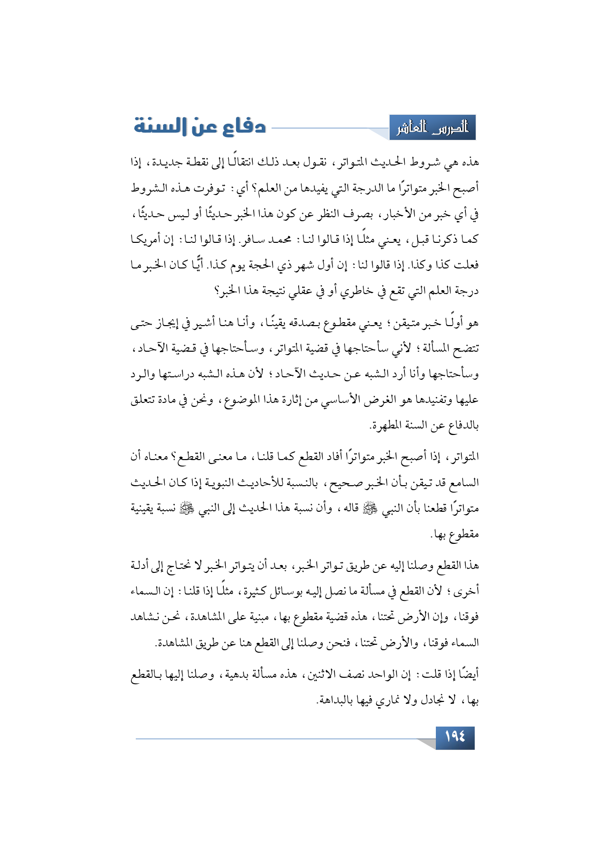 هو أولًا خبر متيقن؛ يعني مقطوع بصدقه يقينًا، وأنا هنا يعني أشير في إيجاز حتى تتضح المسألة؛ لأني سأحتاجها في قضية المتواتر، وسأحتاجها في قضية الآحاد، وسأحتاجها وأنا أرد الشبه عن حديث الآحاد؛ لأن هذه الشبه دراستها والرد عليها وتفنيدها هو الغرض الأساسي من إثارة هذا الموضوع، ونحن في مادة تتعلق بالدفاع عن السنة المطهرة.